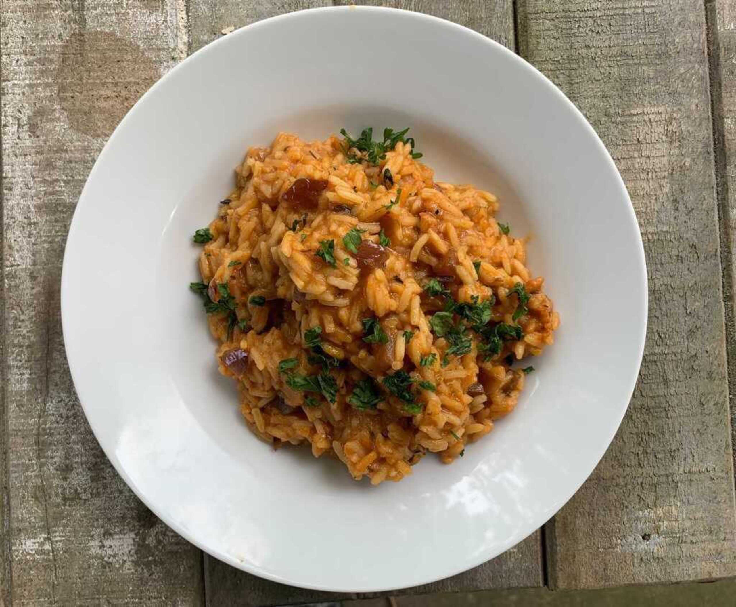 Note that the rice at the bottom of the pot will develop dark caramelization, bordering on scorched. Pay careful attention to the pot when doing this to avoid developing a smoky flavor that is too strong. Also, note that imparting smokiness by this method can be difficult because of the risk of burning. And, some consumers may not enjoy the scorched flavor. Instead, using smoked paprika or liquid smoke is preferred by many cooks.
