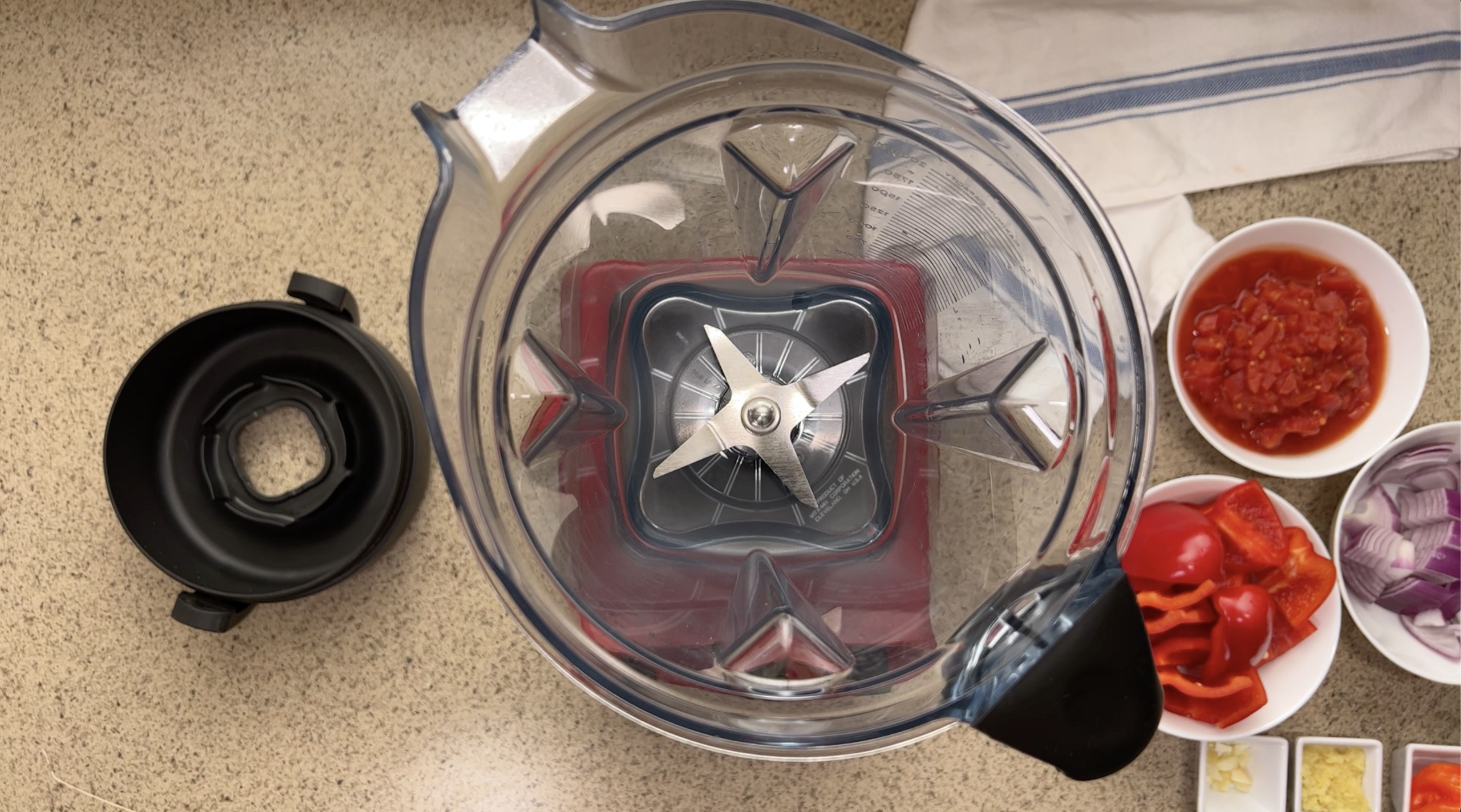 In a blender, combine tomatoes, bell peppers, garlic, ginger, onion, and chile, and blend until smooth.