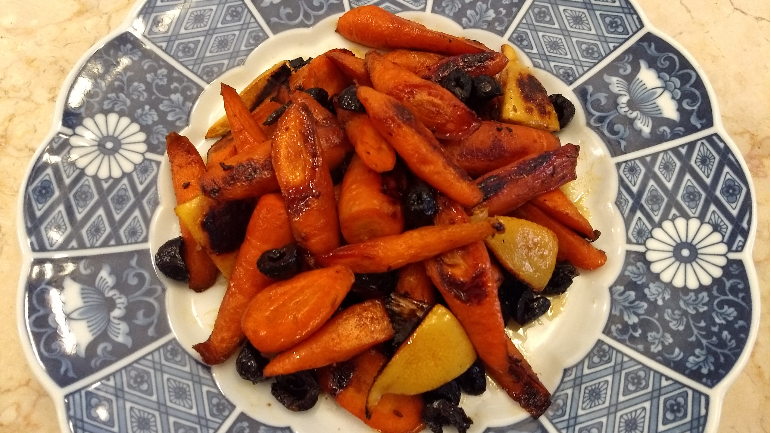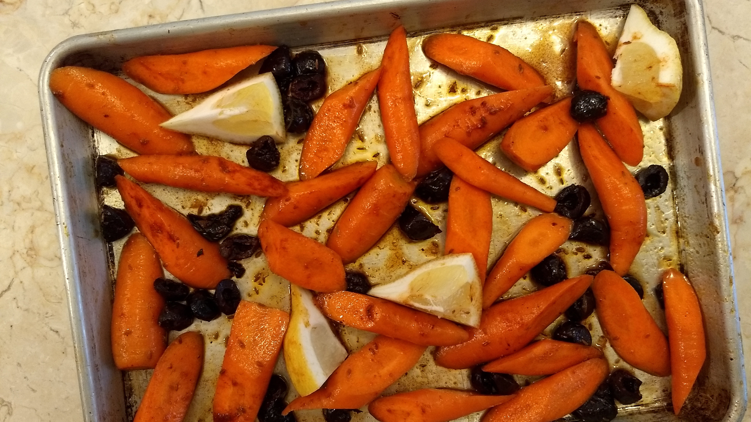 Note that some olive varieties will dry out in the oven and are best added after the carrots are roasted.