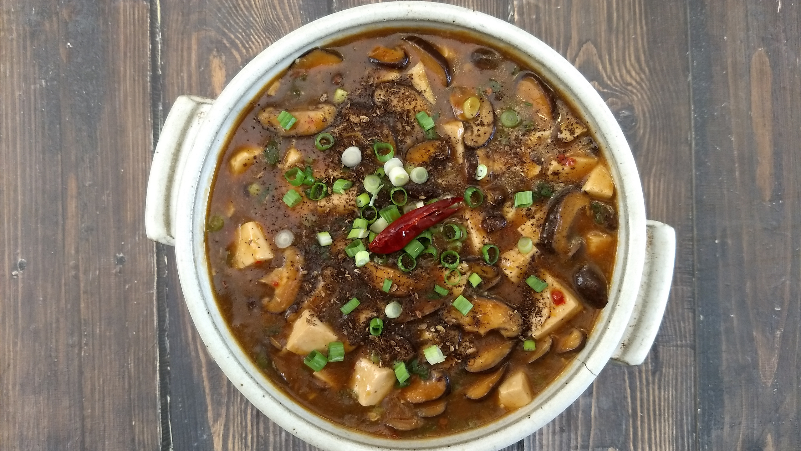 Transfer to a serving bowl and sprinkle with Sichuan pepper and garnish with green onions.