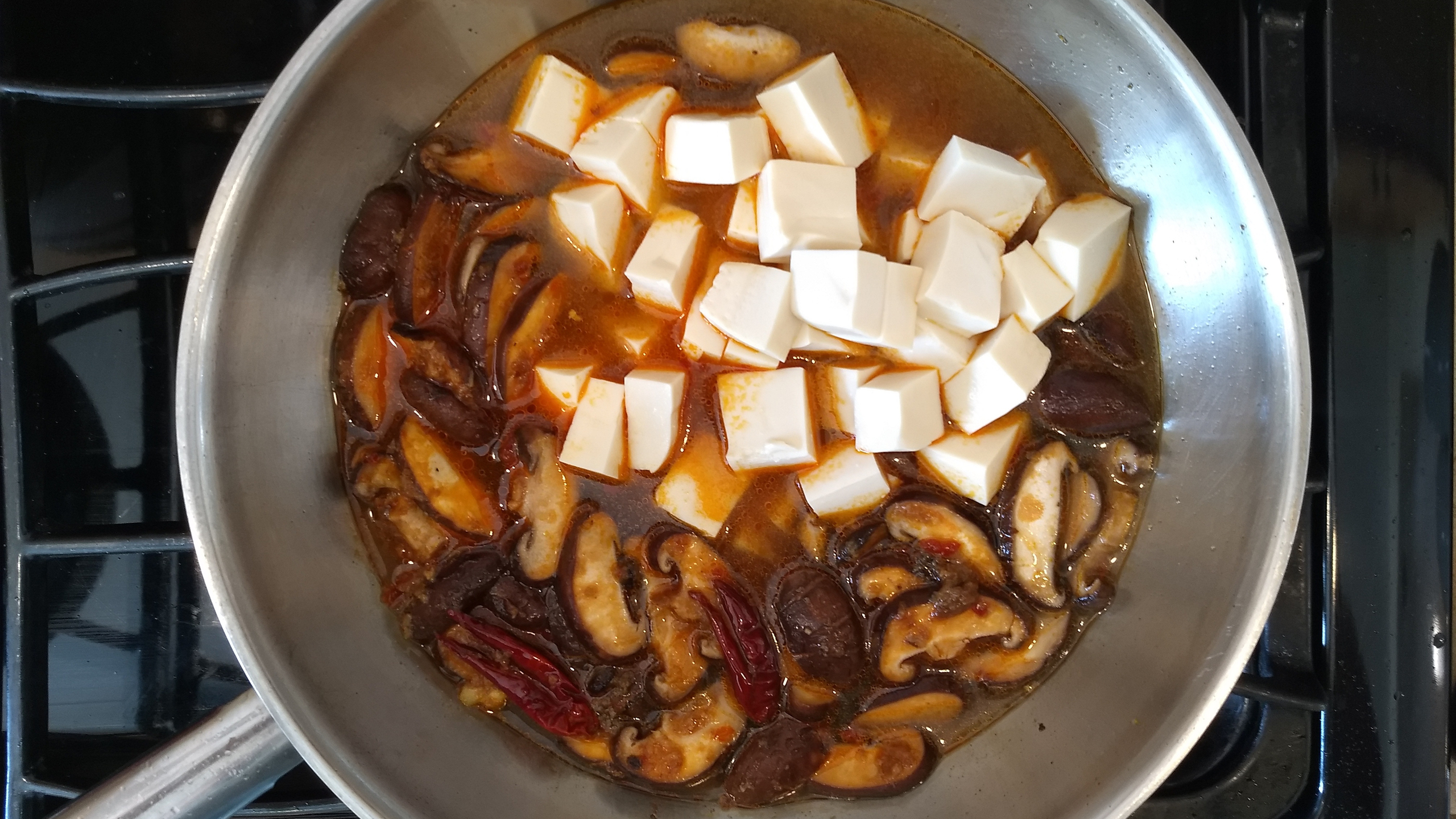 Add the stock and tofu cubes. Be careful not to break up the tofu cubes. Simmer for 5 min, until the tofu absorbs the flavors of the sauce.