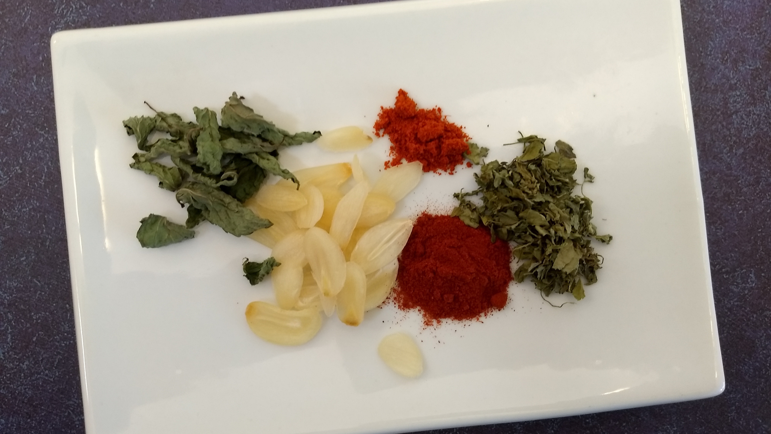 Finely grind the garlic and savory together and immediately mix with the cayenne, smoked paprika, and the whole dried mint.