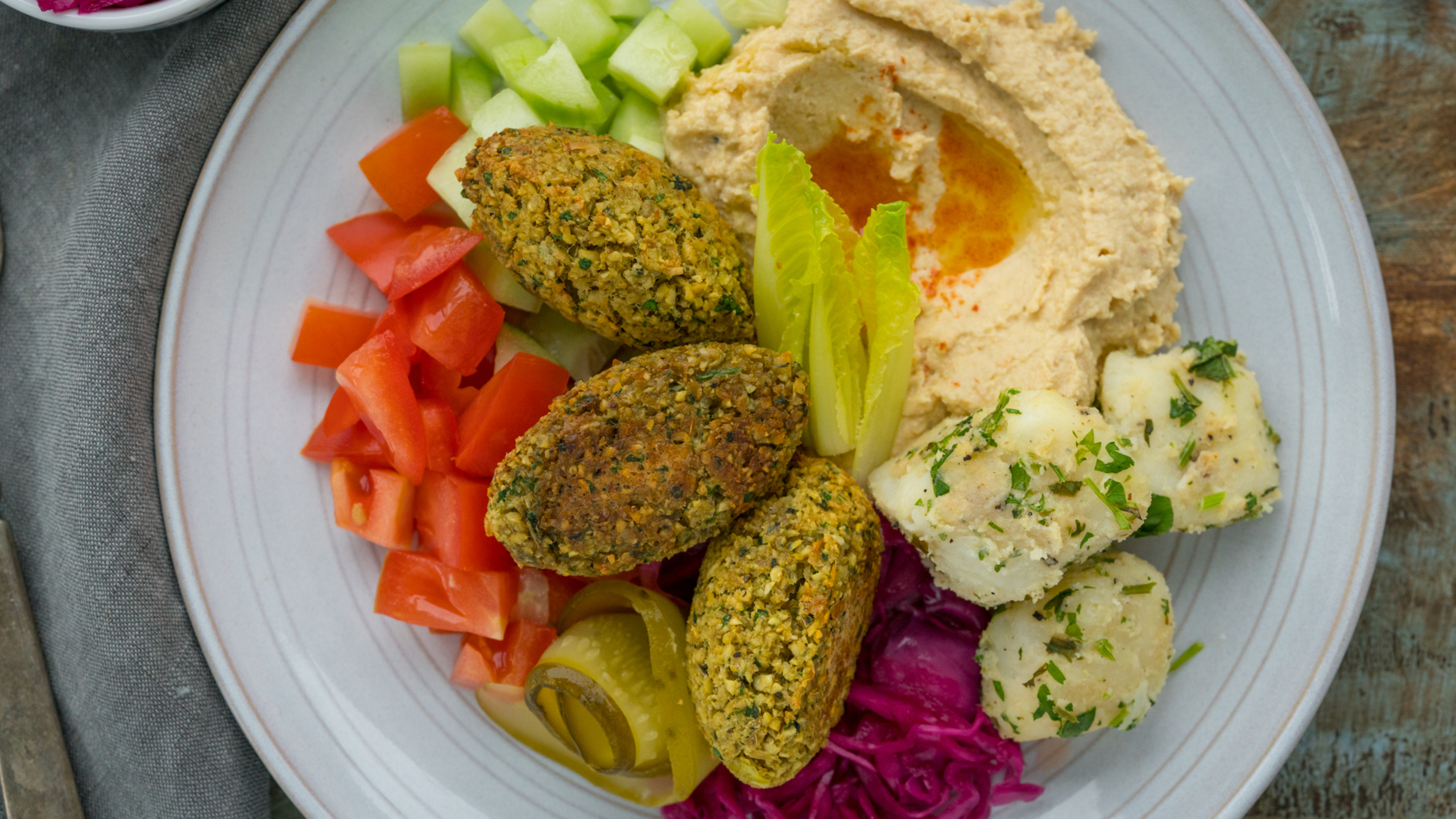 You can form falafels into various shapes, according to your personal preference. Falafels can be round balls, patties, quenelles, or they can be formed using a traditional falafel scoop. The size of the falafels also comes down to personal preference. We typically use about 2 tablespoons per falafel.