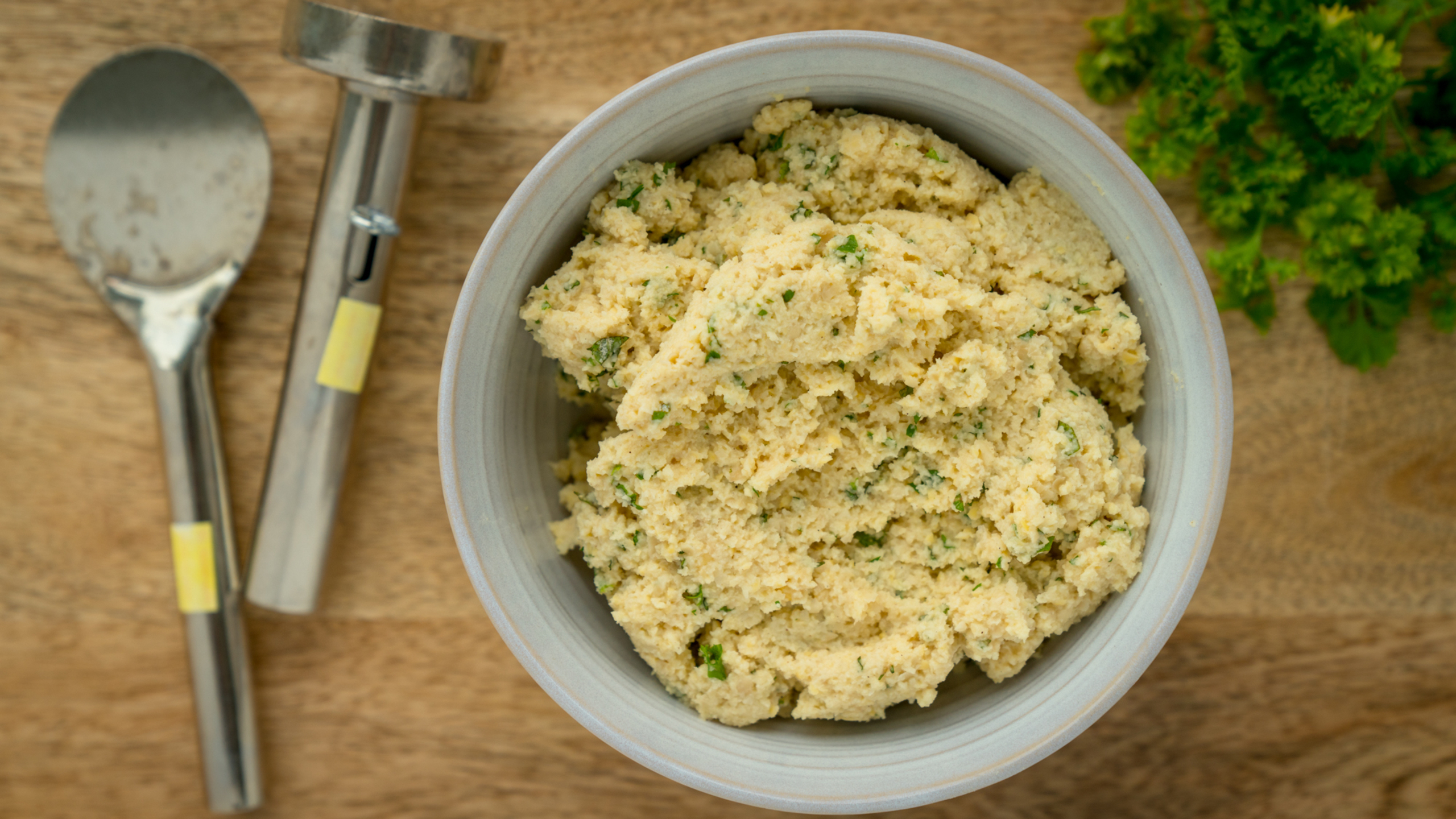 When done, the mixture should resemble something between a course meal (sort of like couscous) and a paste and should hold together when pressed between your hand and fingers. If using regular flour, the 2 tablespoons are likely enough—if using chana flour, you may need to add a bit more.