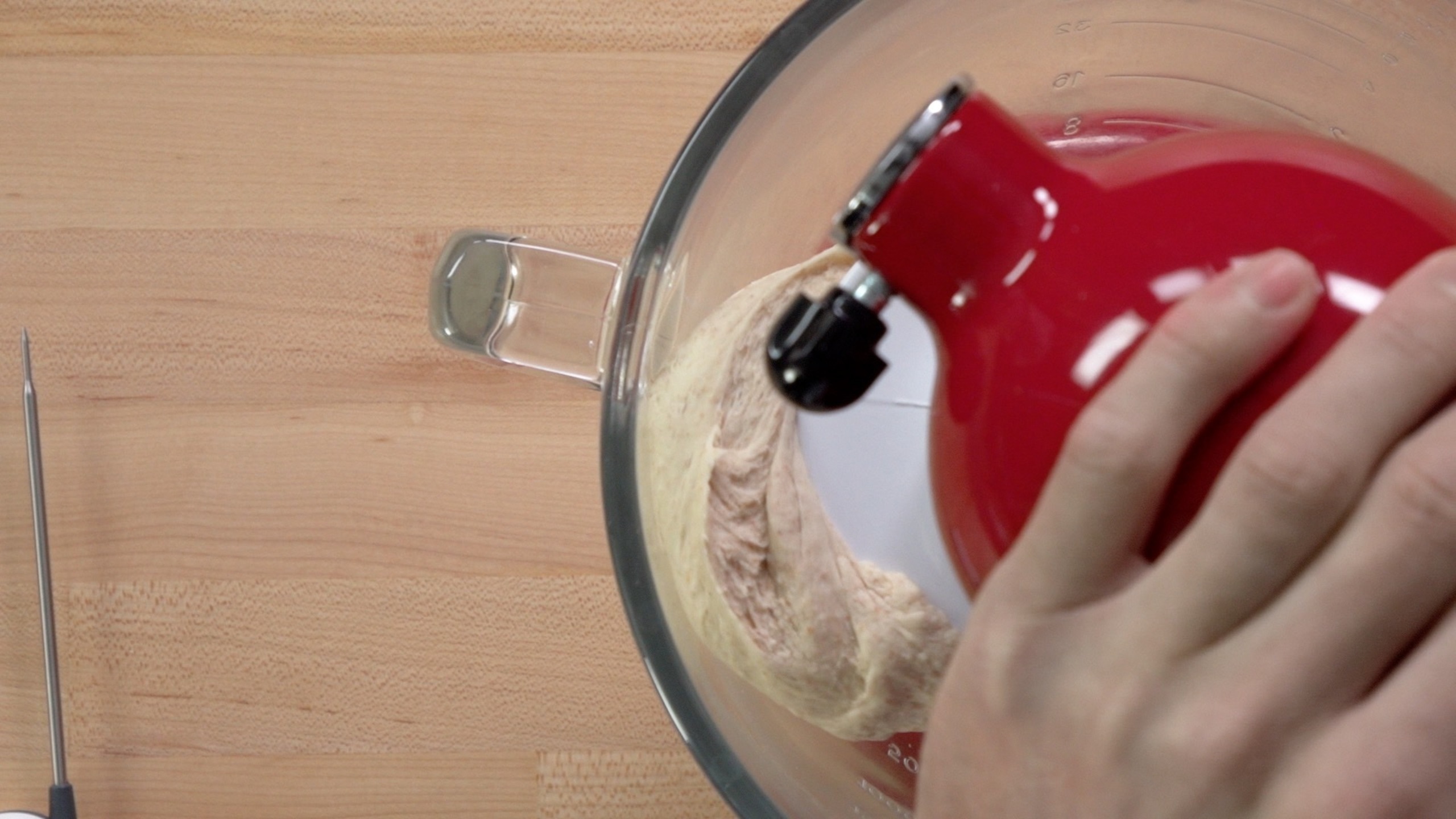 Mix on low speed for 3 minutes using the hook attachment. Scrape the hook and bowl. Mix for 2 more minutes. Increase to medium speed for at least 10 minutes. The final temperature of the dough should be 73-77˚F (23-25˚C).
