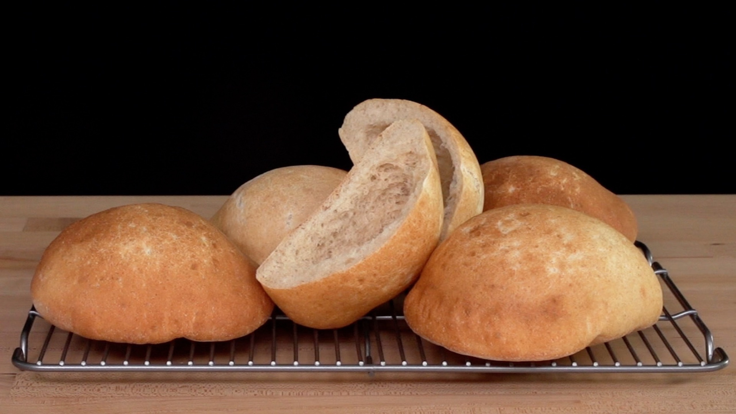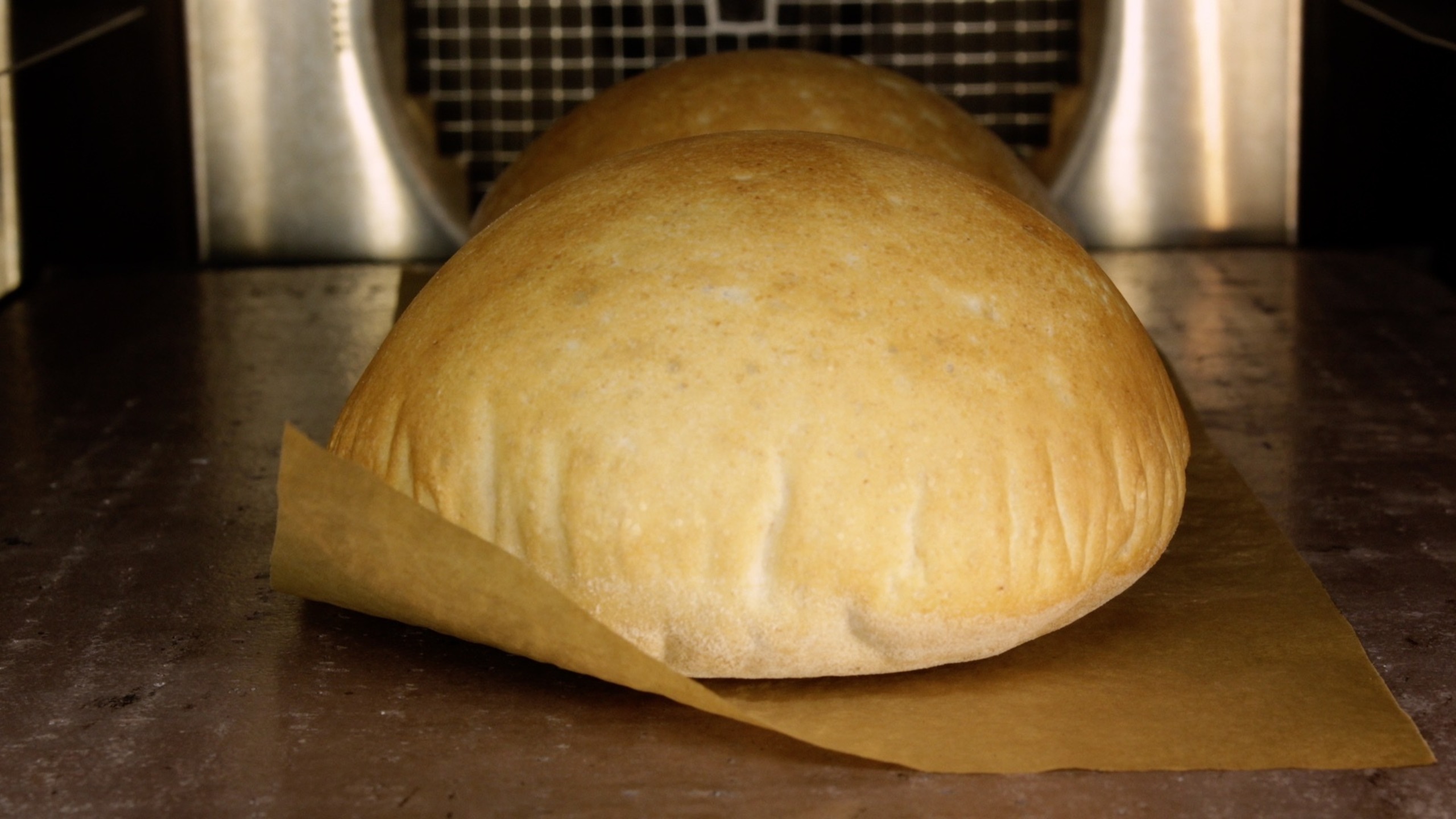 Transfer the pita on a baking tray lined with parchment paper, or directly on an oven peel. Slide the parchment onto the baking stone. Swiftly add the reserved water to the baking tray and close the oven door. Turn off the oven for 6 minutes. Now turn the oven back on and lower it to 430˚F (220˚C) for 3 minutes.