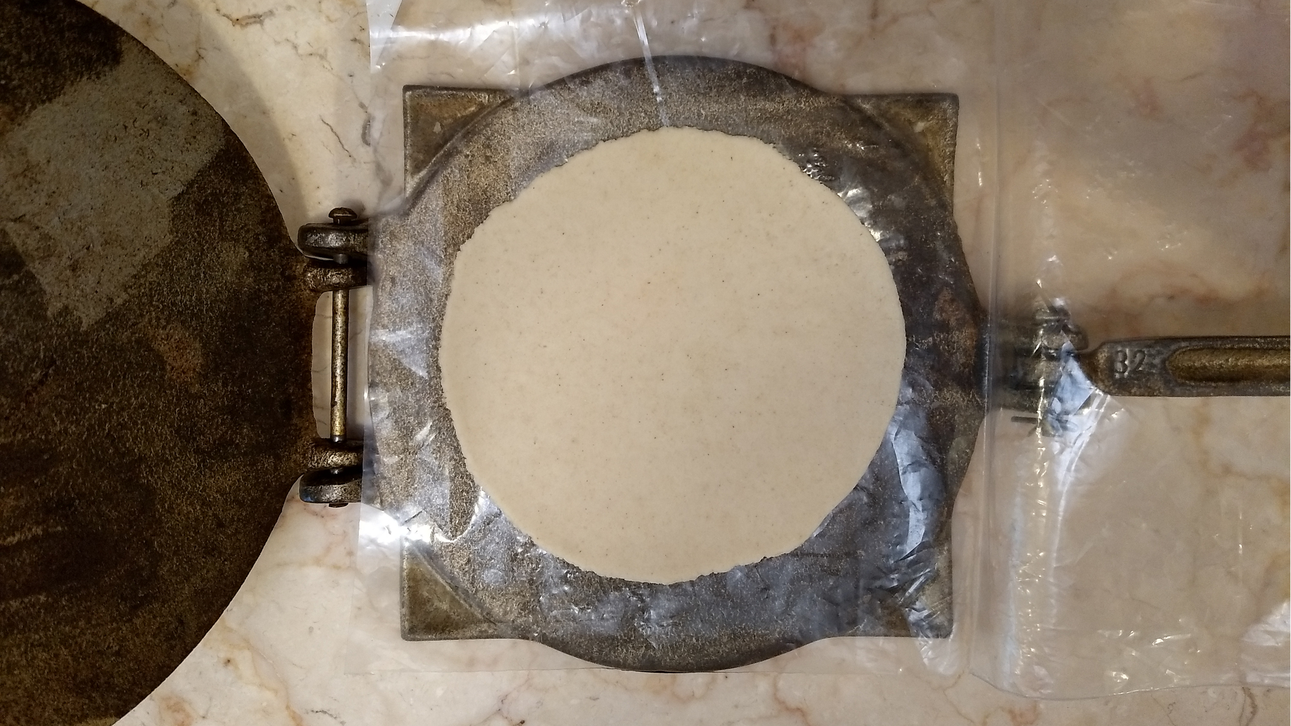Using a tortilla press lined with plastic, or a clean hard surface and a cutting board lined with plastic, press the masa balls to a thickness of ⅛ inch (3 mm).