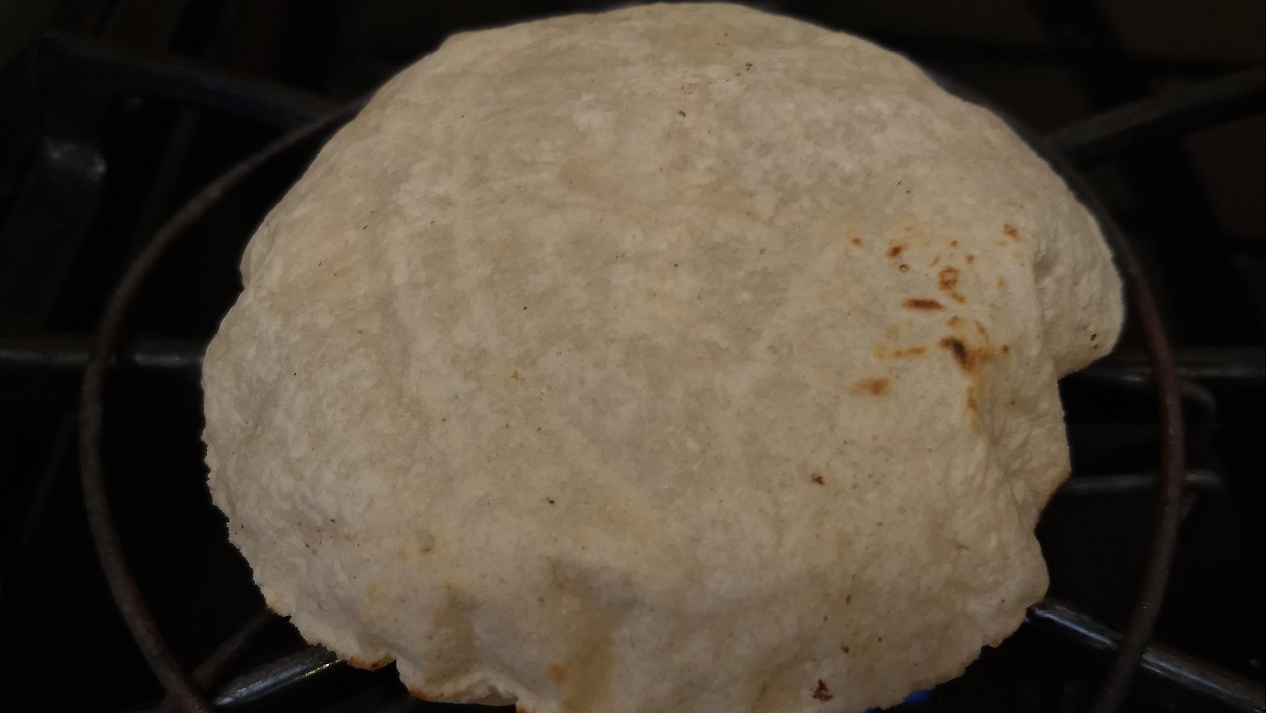 As the tortilla cooks on the second side, carefully press the surface by hand, with a folded cloth towel or a spatula. This will help the tortilla to puff and rise from the steam. The tortilla is now ready.