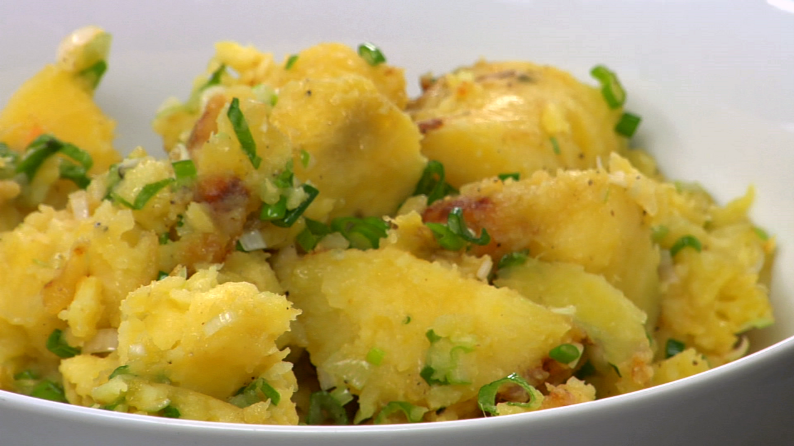 This smashed sweet potato recipe is a snap! Just bake, chop green onions, toss and serve! It looks pretty and has a warm sweet flavor that goes perfect with many braised and/or roasted dishes.