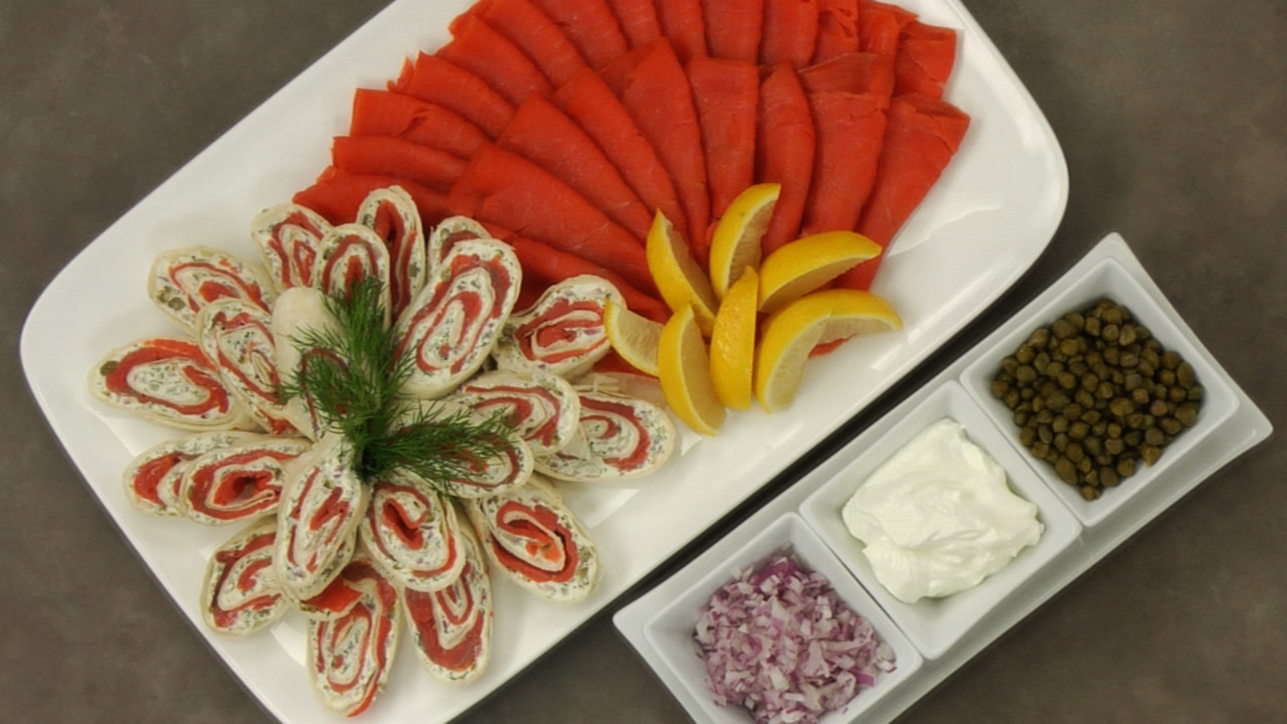 Once the salmon rolls are firm, unwrap and slice on the diagonal. Arrange on the platter in a flower-like fashion. Garnish with the dill and lemon wedges. Serve with diced onions, sour cream and capers.