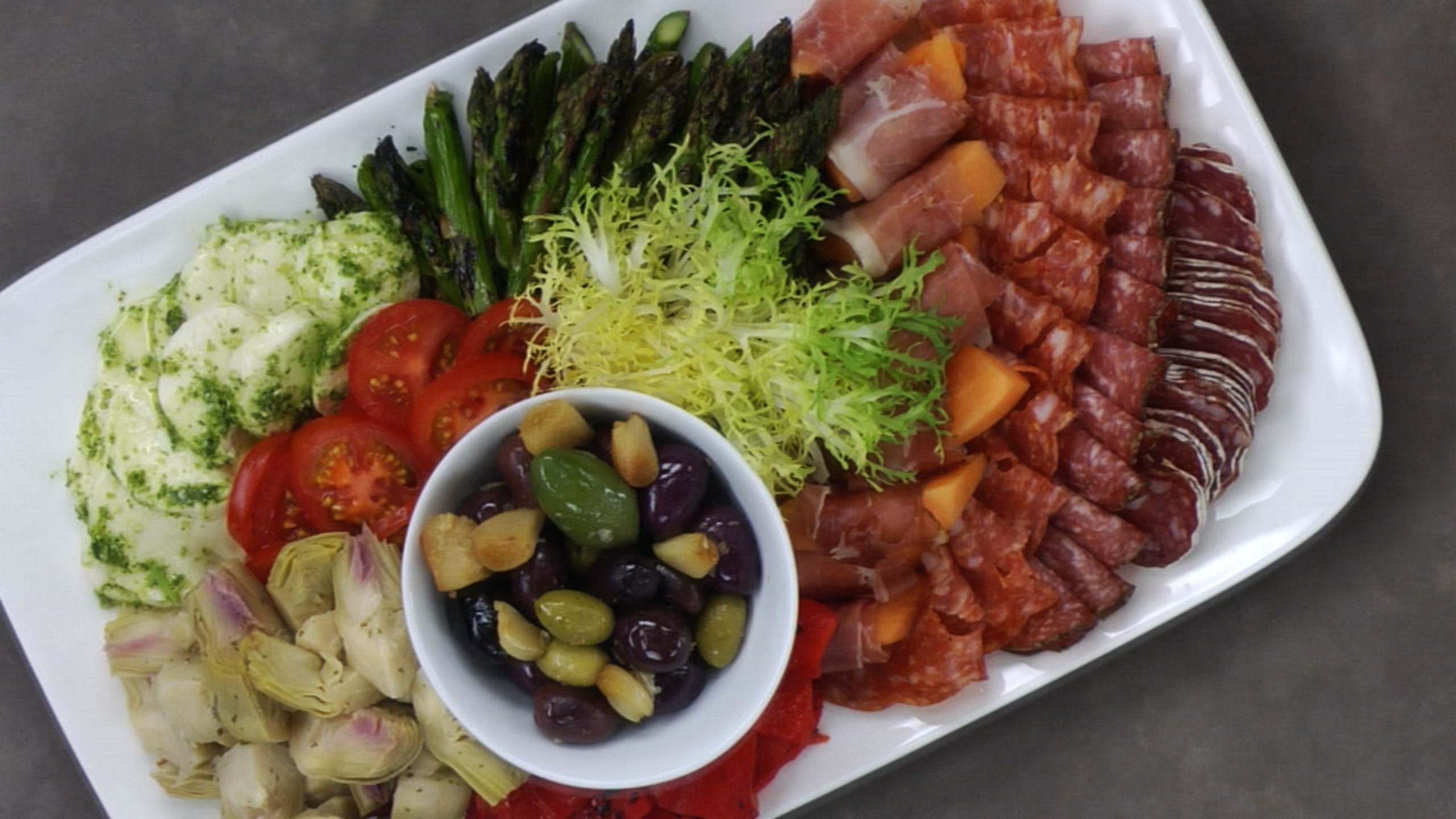Next, add the prosciutto-wrapped melon. Fan out the asparagus ends, and set the tips on top of that. Place a small bowl of marinated olives in the center. Add the bocconcini and drizzle with some of the pesto oil. If you are arranging the platter far in advance, hold off on this until just before serving.