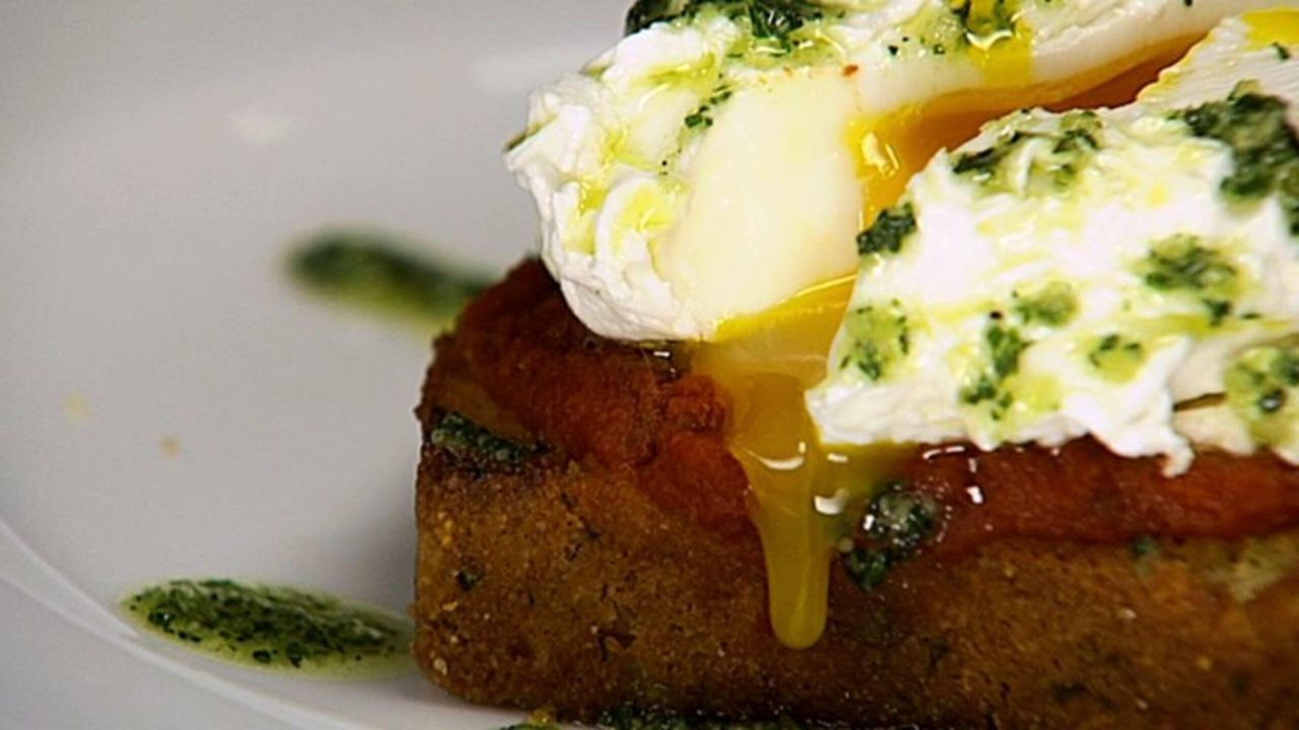 To assemble, remove the warmed cornbread and plates from the oven. Top each piece of cornbread with a hot poached egg. Lightly season the egg with salt and freshly-cracked pepper. To finish, drizzle the plate with a bit of the pesto and serve immediately.