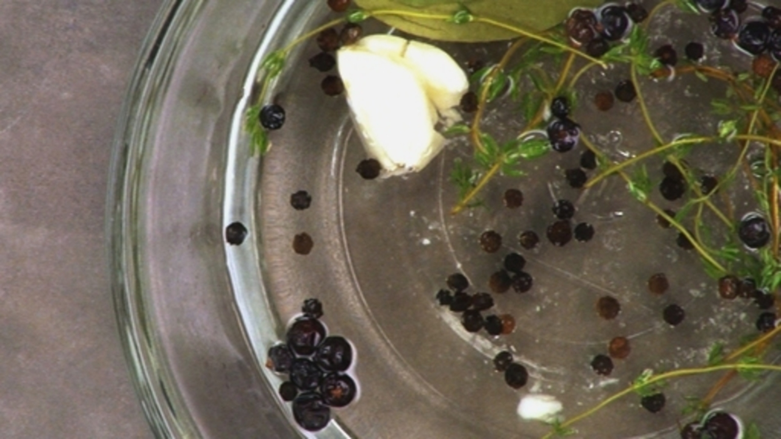 Smash the whole clove of garlic and add it to the pot. Press the juniper berries to release their aroma. Add the berries, peppercorns, bay leaves and thyme and bring the mixture to a gentle boil. Turn off the heat, cover with a lid and let steep for about 20 to 30 minutes.