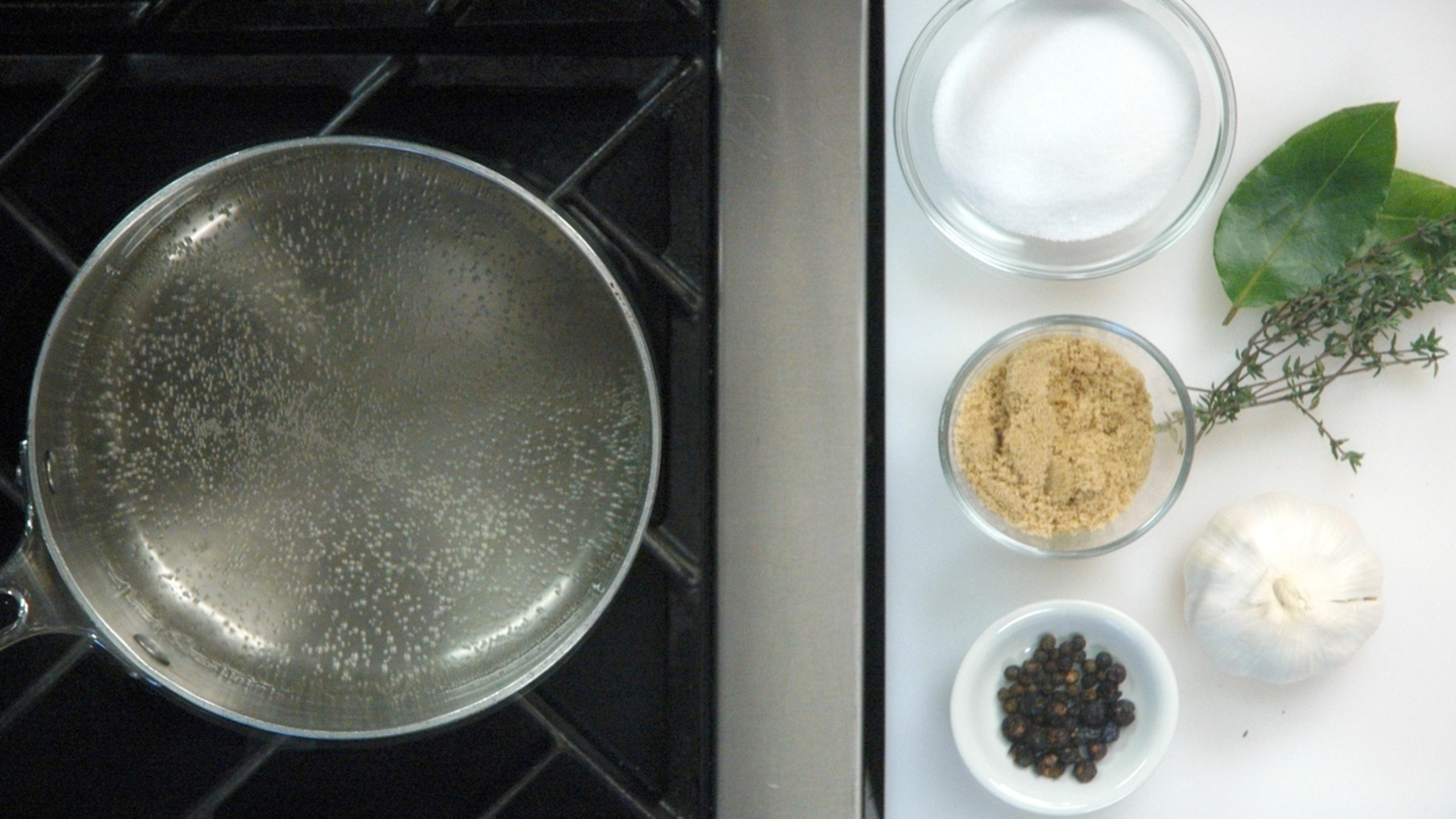 To prepare the brine, place one cup of water into a small pot and bring to a simmer. Add the salt and sugar and stir to dissolve.