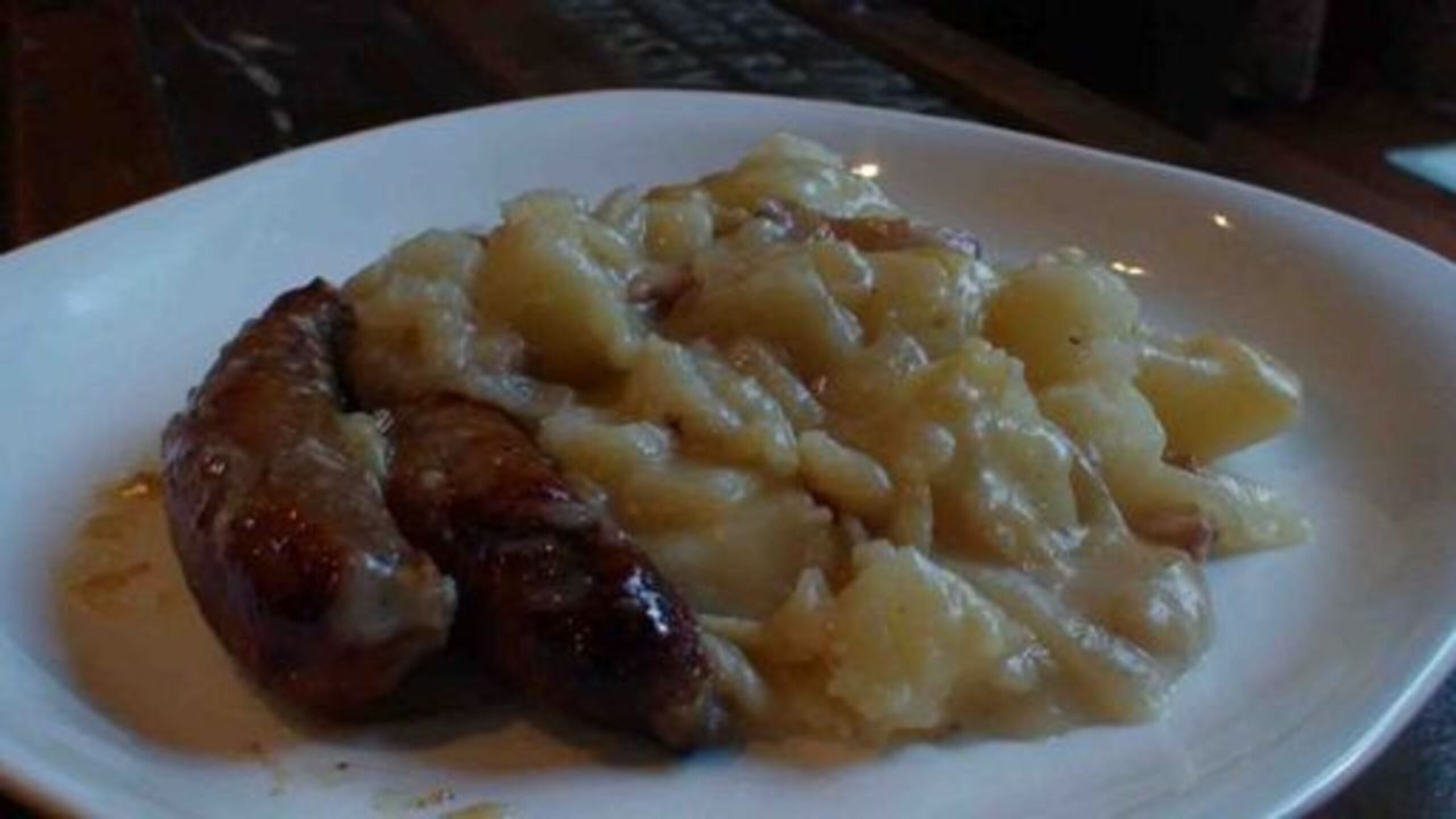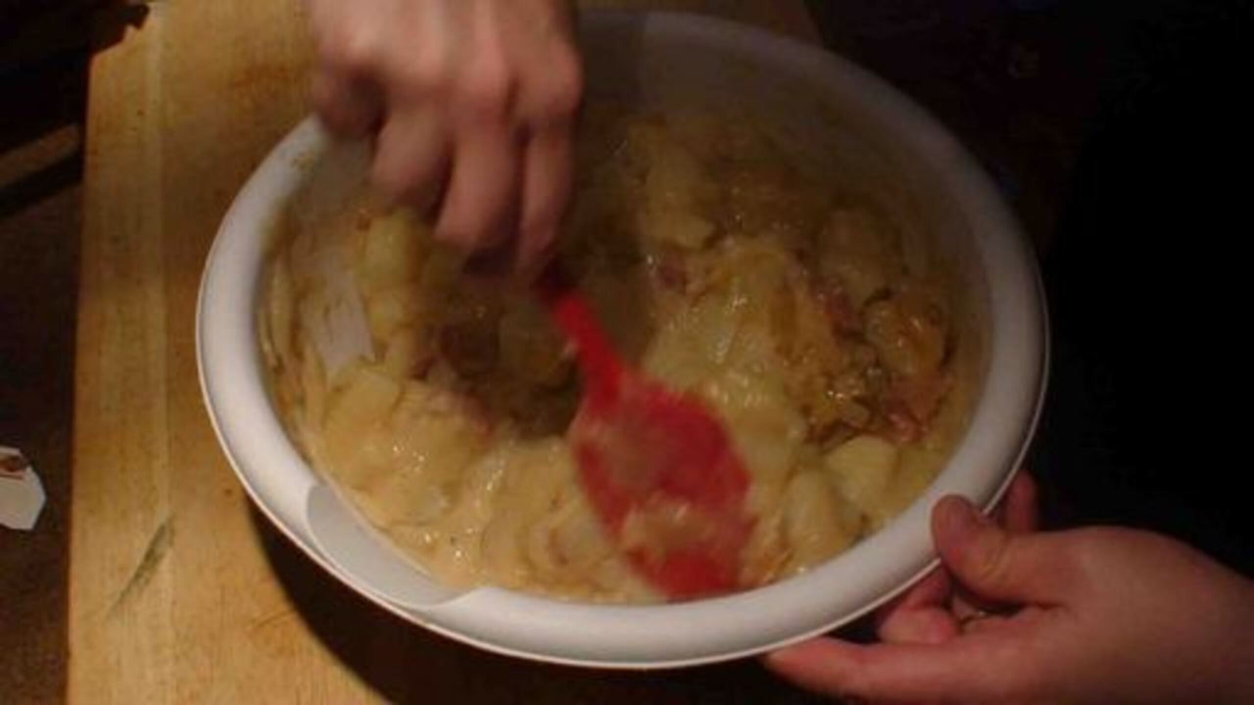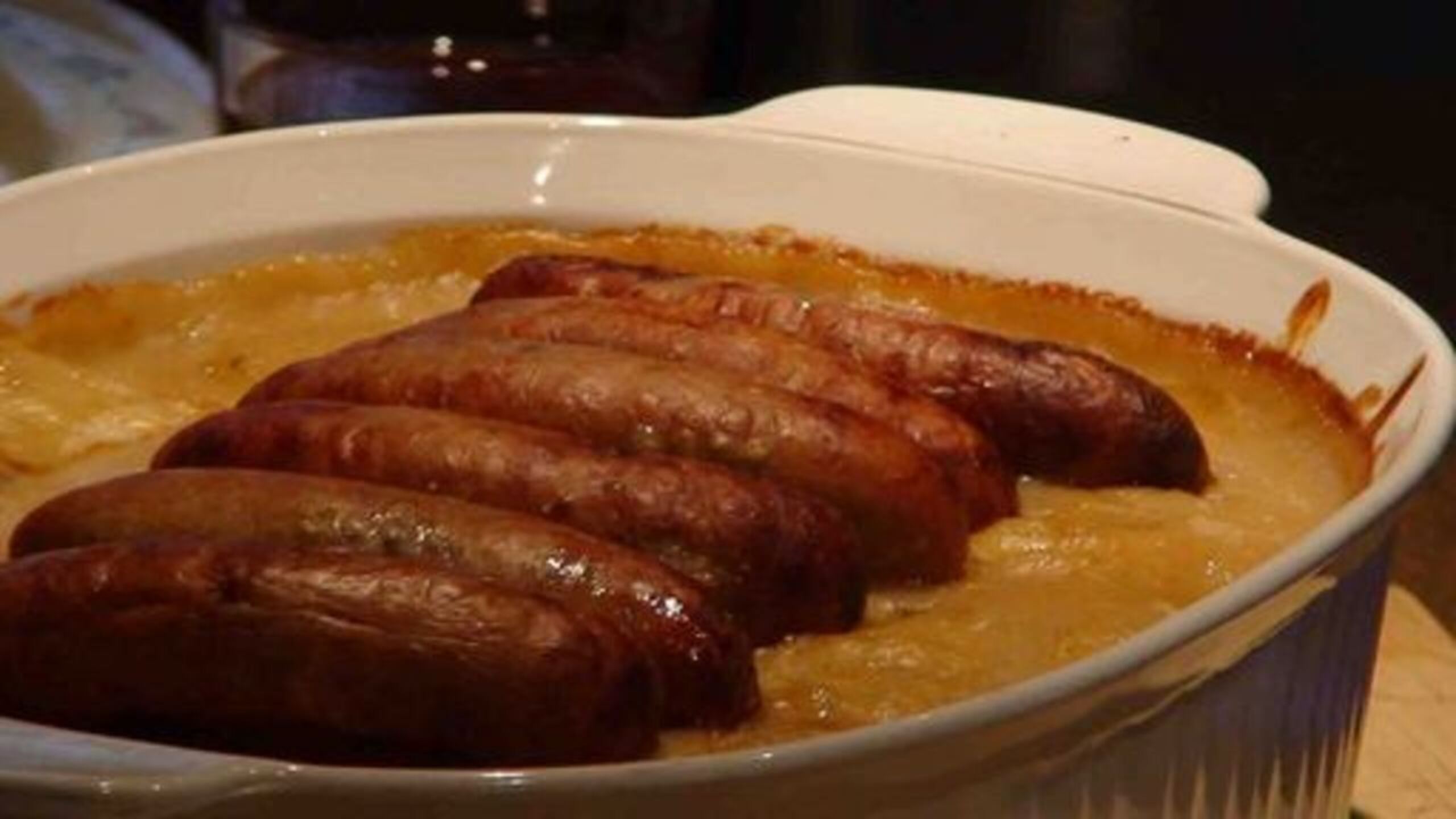 In a large bowl combine the cooked potatoes and roux. Now fold in the cooked bacon and onions. Once everything is combined pour it all into an oven proof casserole dish. Flatten it all out. Remove some thyme leaves and finely chop them up and sprinkle over the top. Now lay the sausage across the top and you’re ready for the oven.
