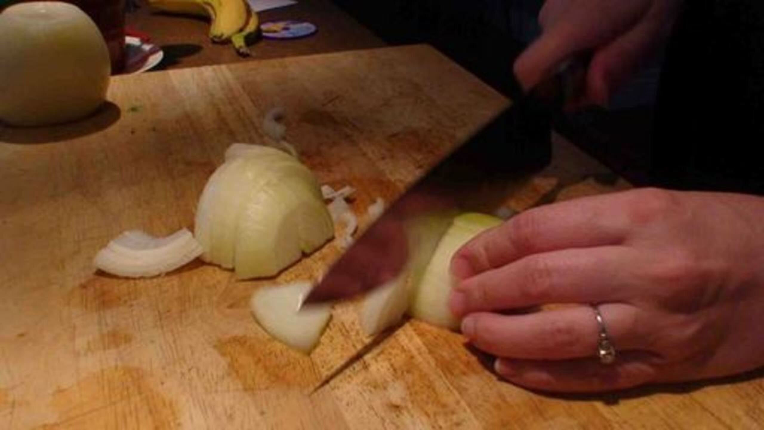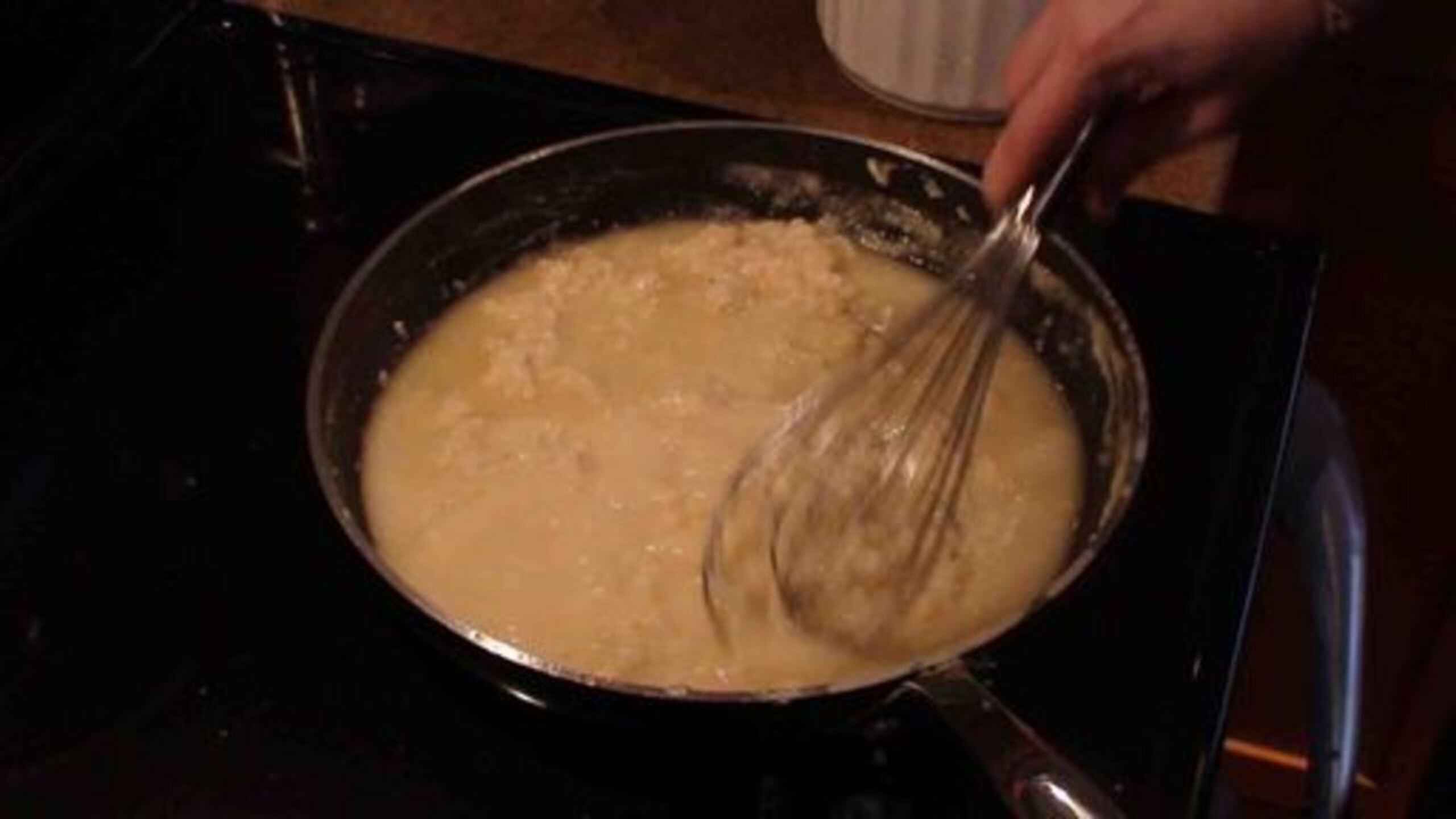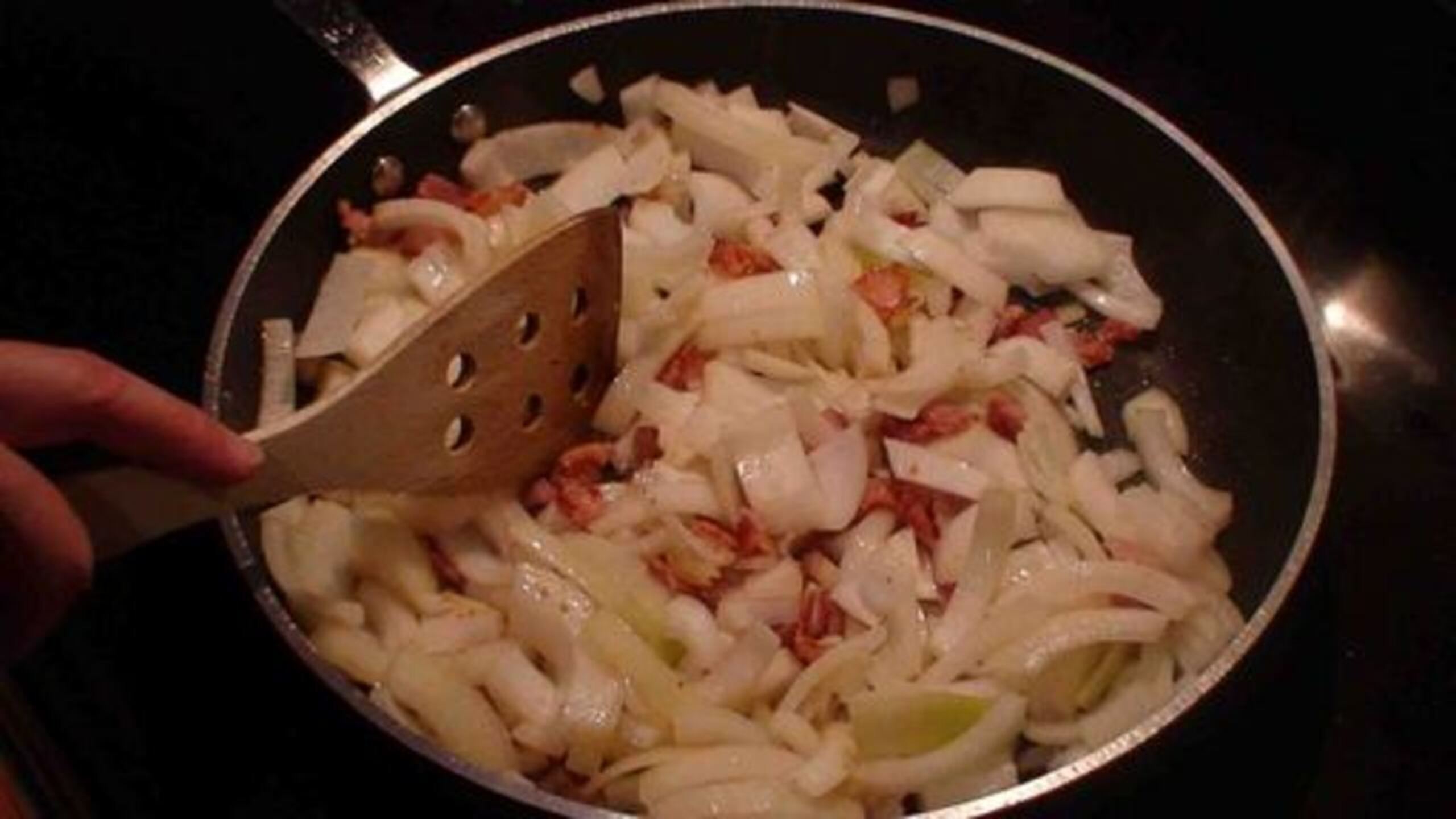 The bacon is best if it’s frozen because it’s easier to cut. Cut into bit size strips. Cook the bacon till the fat renders out then add the onions and cook till translucent. When they are done cooking set them aside but leave the rendered fat in the frying pan for the roux.