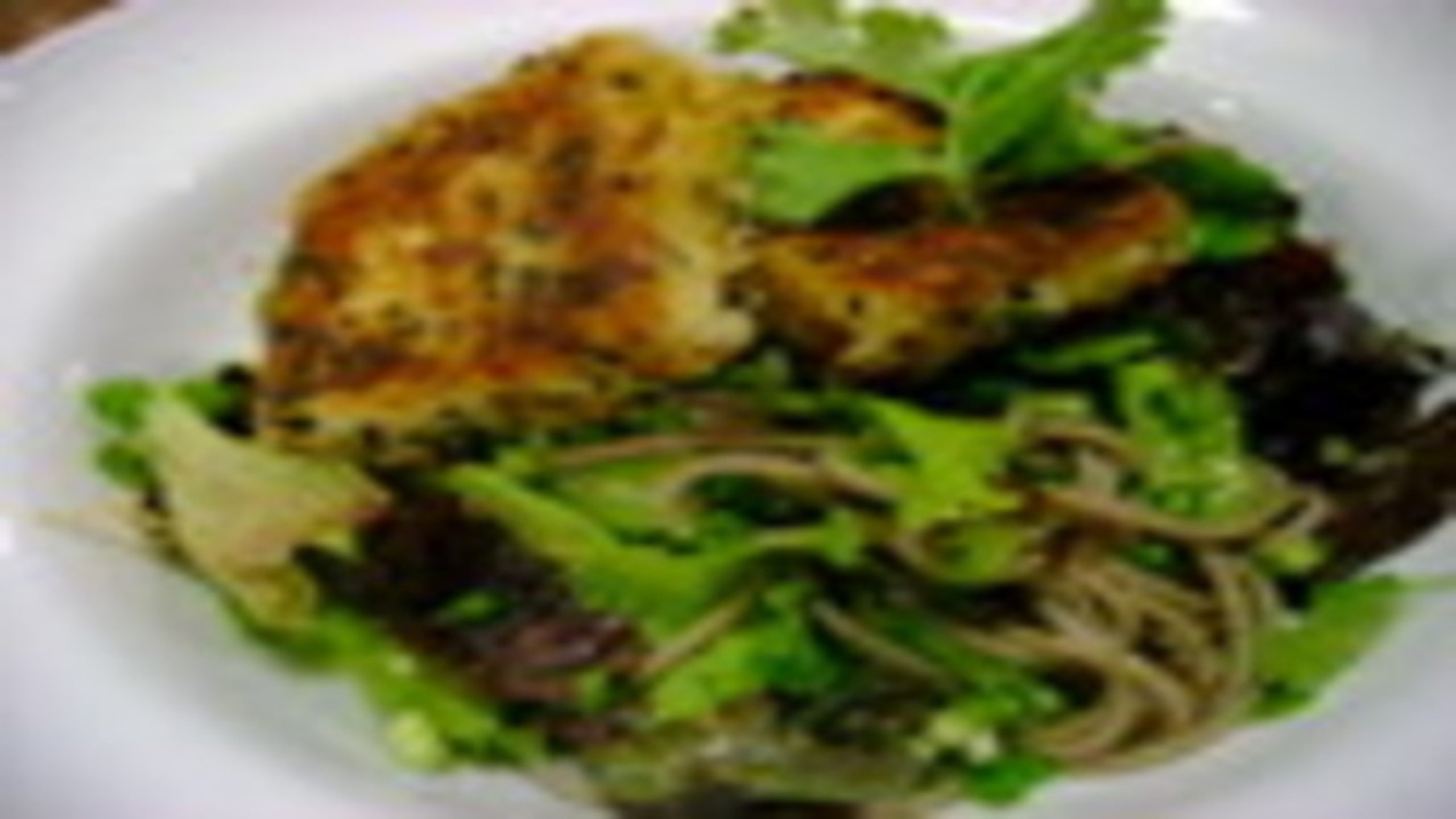 While the tofu is cooking, combine the greens, cilantro leaves bean sprouts, sugar snap peas cooked asparagus, soba noodles and about 1/2 of the vinaigrette. Divide into four plates and top with the tofu. Serve tofu hot with the rest of the vinaigrette as dipping sauce.