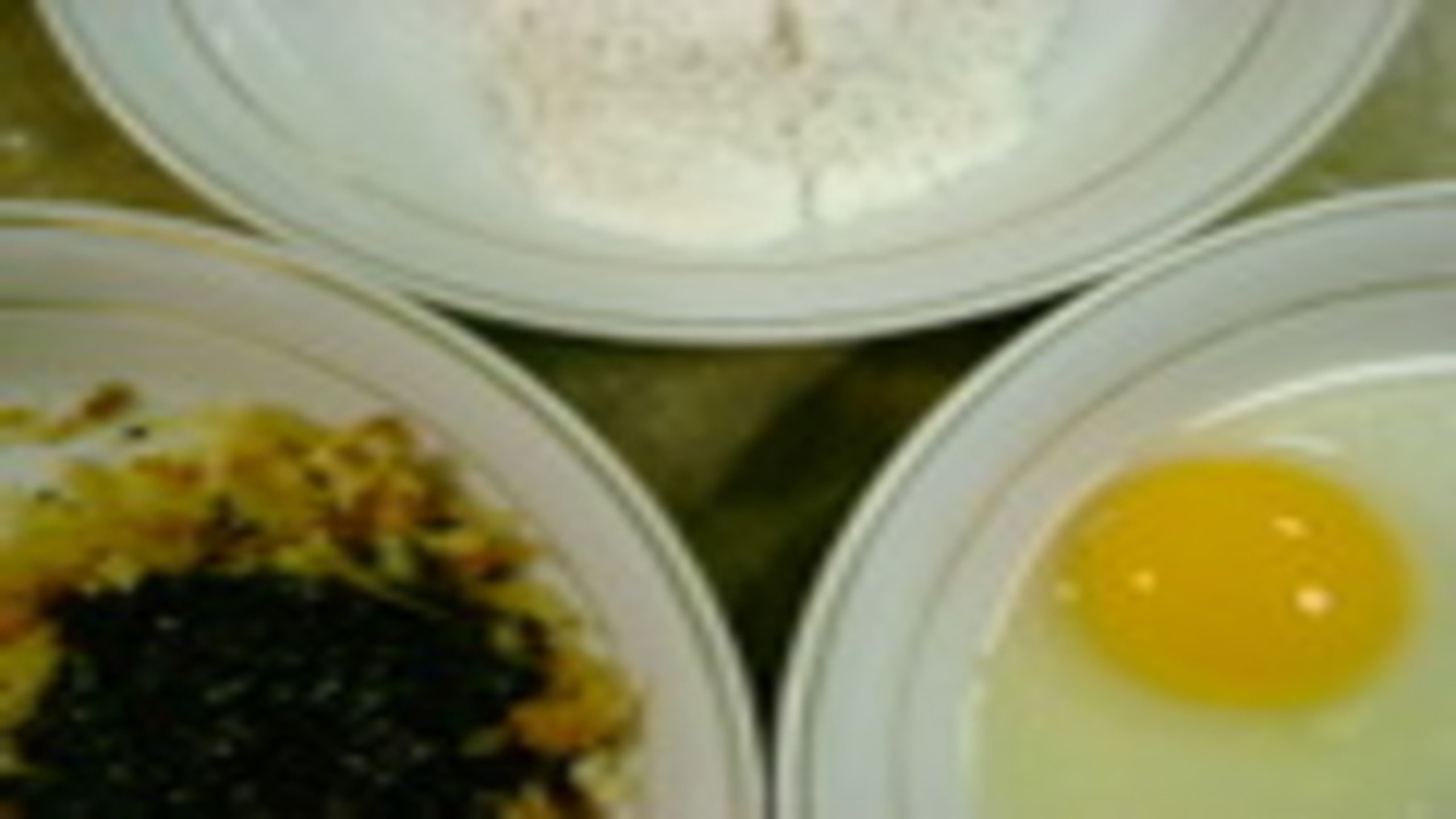 While the water is boiling, assemble the sesame-crusted tofu. Place the flour on the first plate. On the second plate, beat the eggs and on the third plate, combine the bonito flakes and the black sesame seeds.