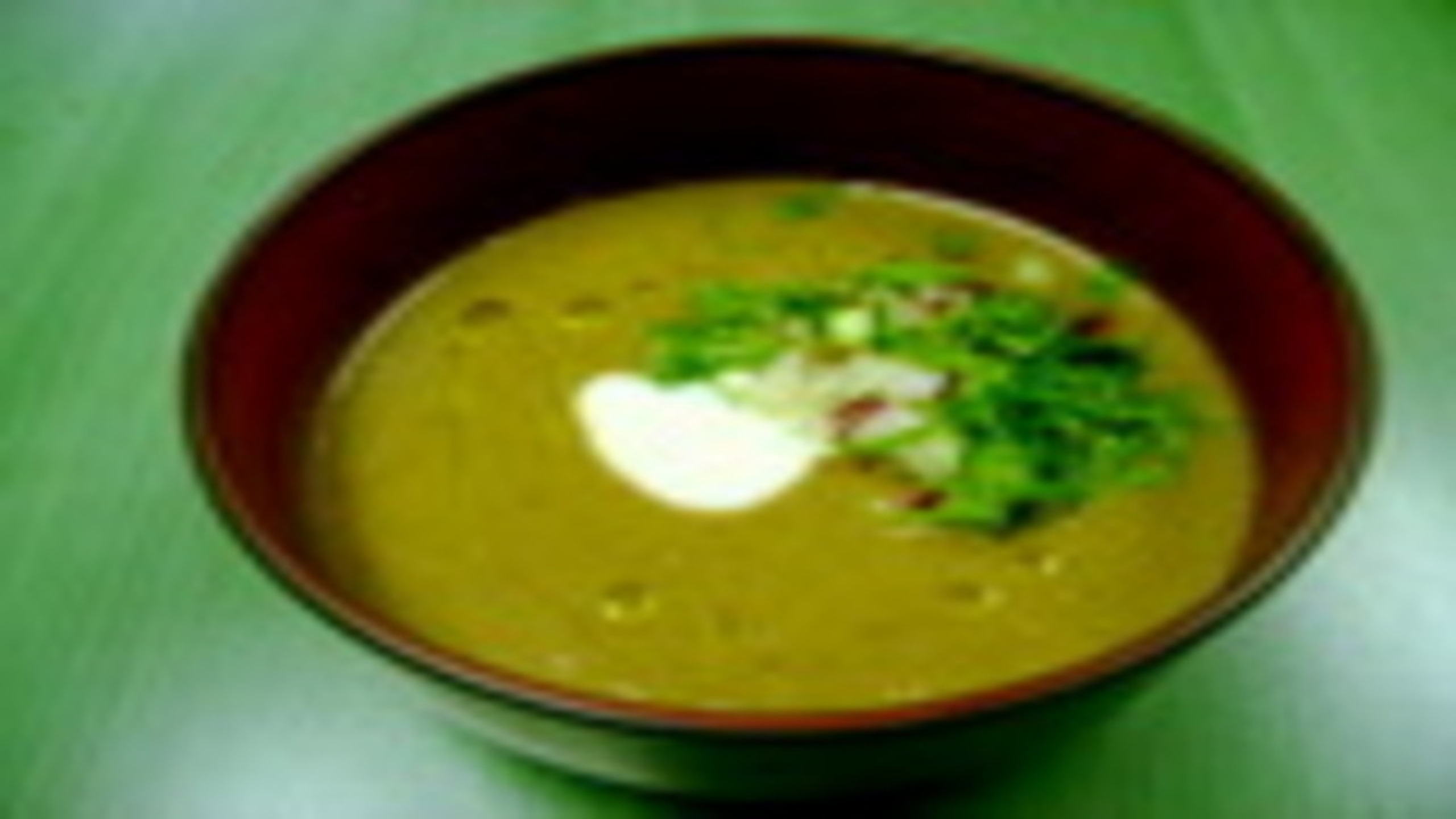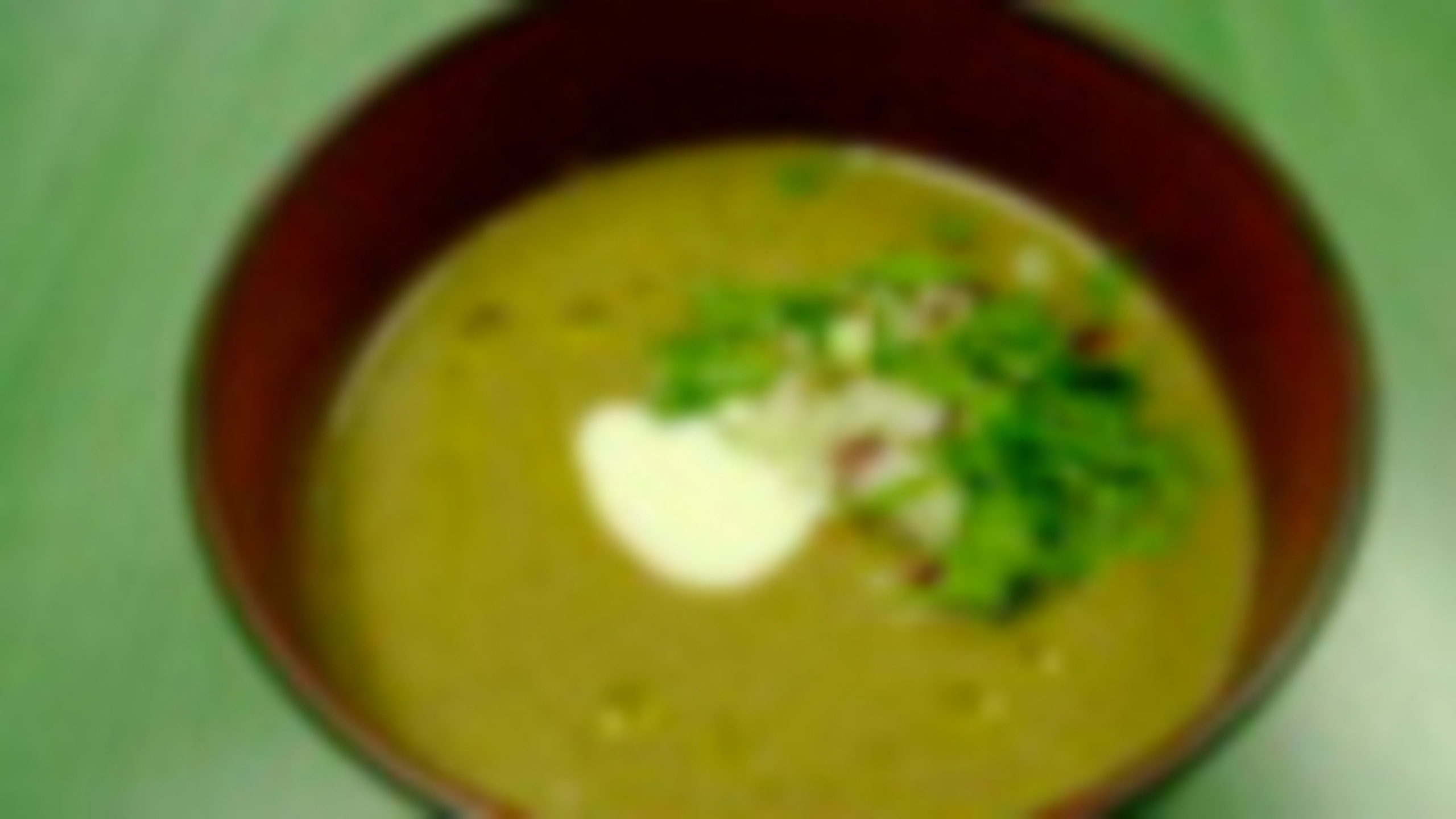 Cool the soup slightly. Working in batches, puree soup in blender until smooth and transfer each batch to a clean pot. You may need to add more stock if desired. While soup is reheating over a low simmer, chop the cilantro and set aside.