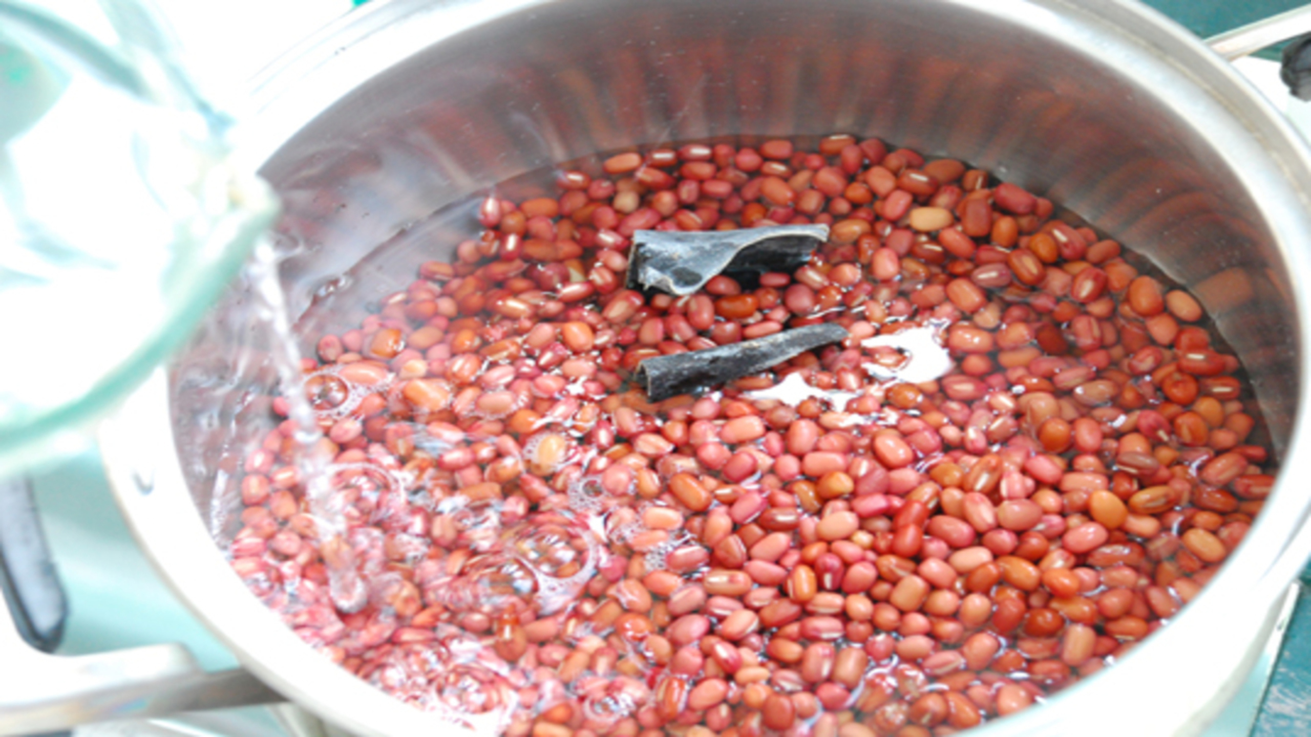 Drain the adzuki beans and rinse. Place beans in pot along with the kombu and add 4 cups of water. Bring to a boil, and then lower heat. Skim off the foam. Cover the pot with lid but still slightly open. Simmer until the beans are tender about 45 minutes. Strain the beans saving the liquid. Discard kombu.