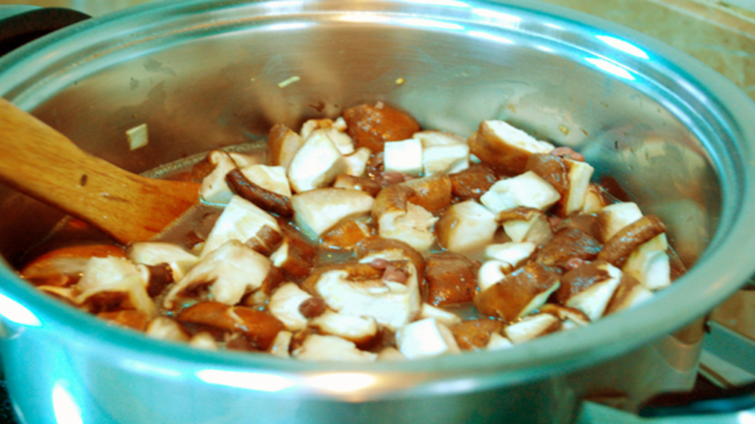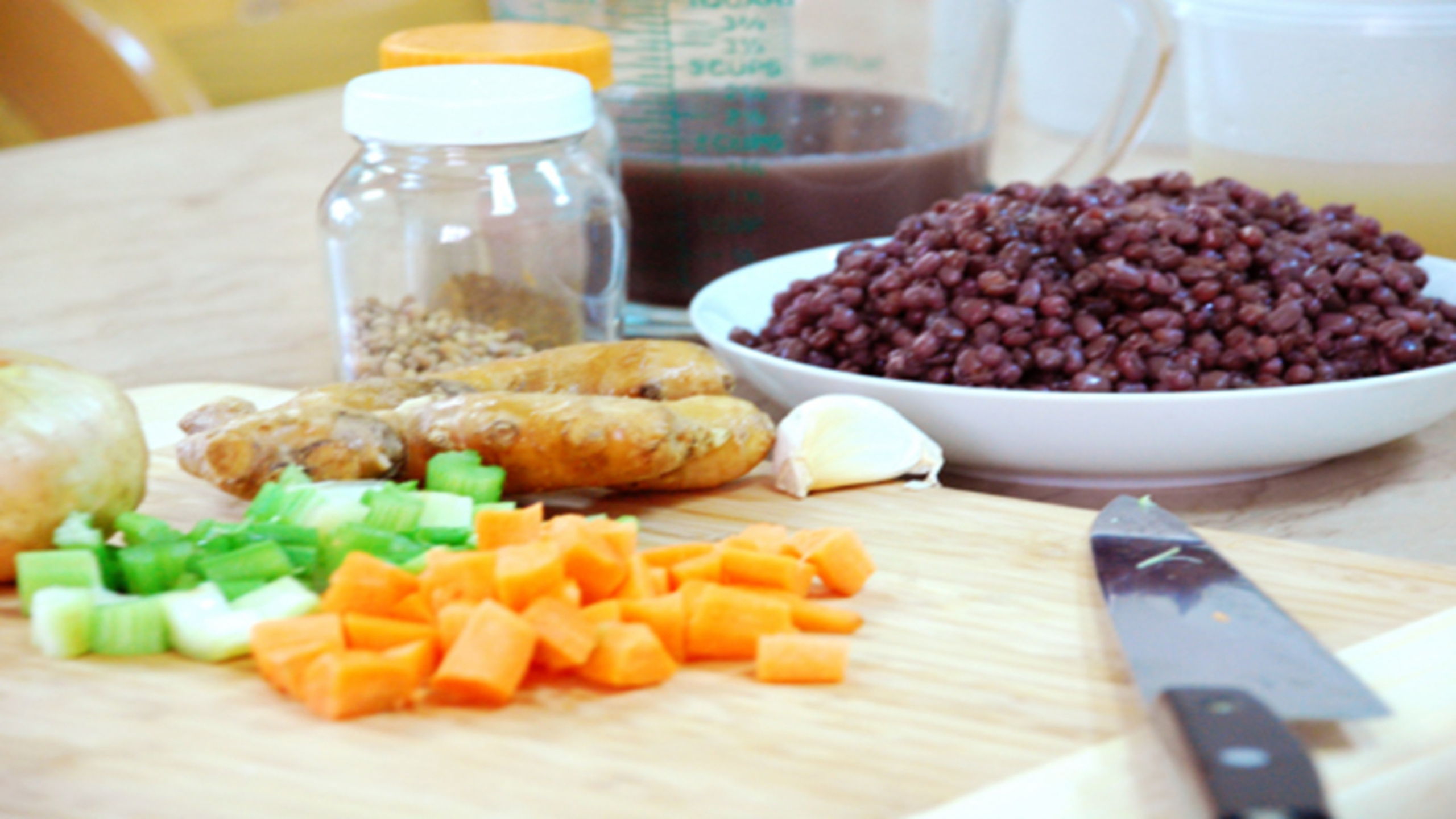 While the vegetables are cooking, dice the shiitake mushrooms. Then add these along with the cooked adzuki beans and stock to the vegetables. Bring to a boil and then lower the heat. Simmer until all vegetables are tender about 15 to 20 minutes.