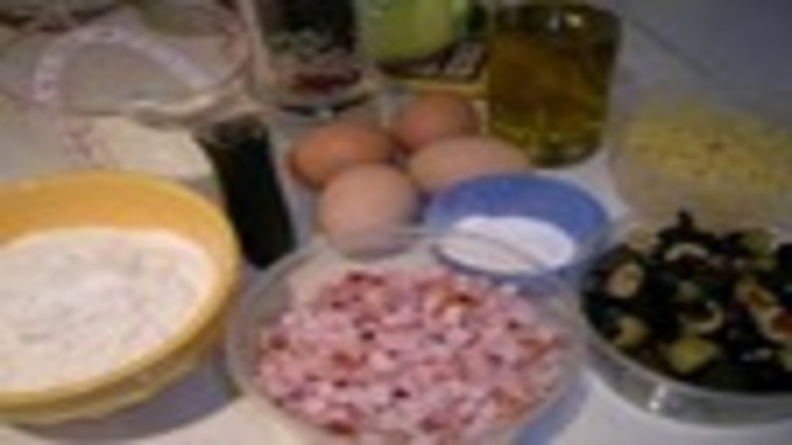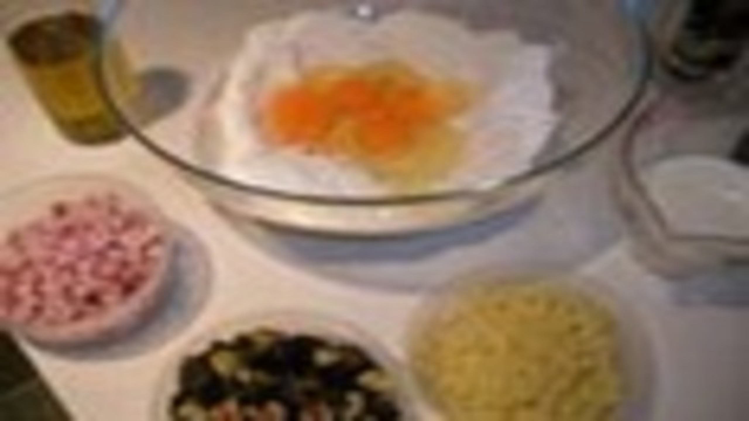 Combine the olives, back bacon, cheese and pepper (to taste) to the flour-egg mixture.