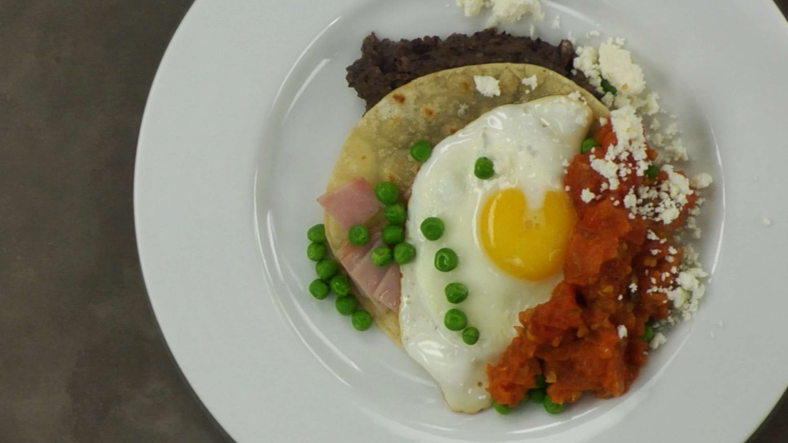 Spoon a few tablespoons of the refried beans onto each plate and then top with a tortilla and a bit of diced ham. Once the salsa has cooked, check for seasoning and set aside.