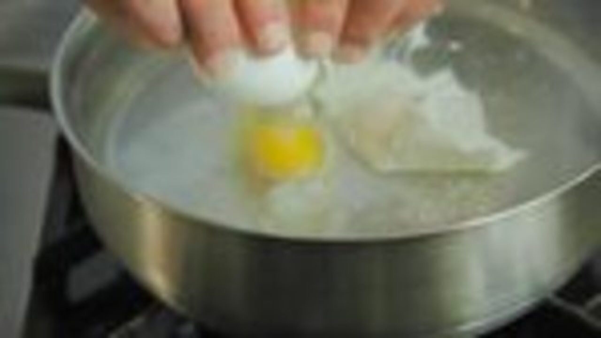 Heat a shallow pan with water and bring to a low boil. Add the vinegar and salt to the water, then crack each egg carefully and place into the water. Cook until the whites are fully cooked.