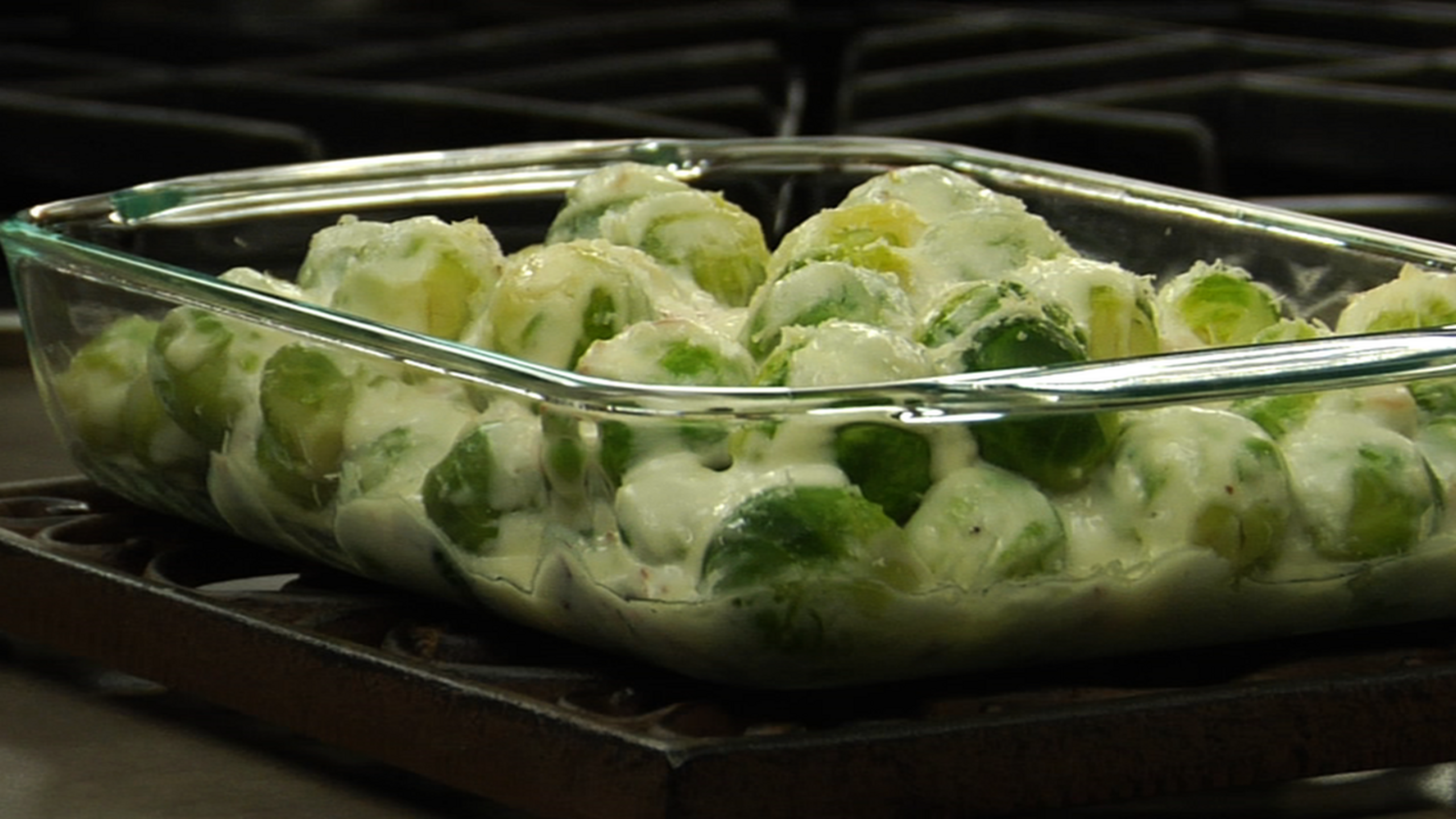 Make sure the Brussels sprouts are well drained before pouring them into the sauce. Any added water will thin down the sauce. Gently fold the sauce and Brussels sprouts together. Pour into a casserole dish and top with the grated cheese.