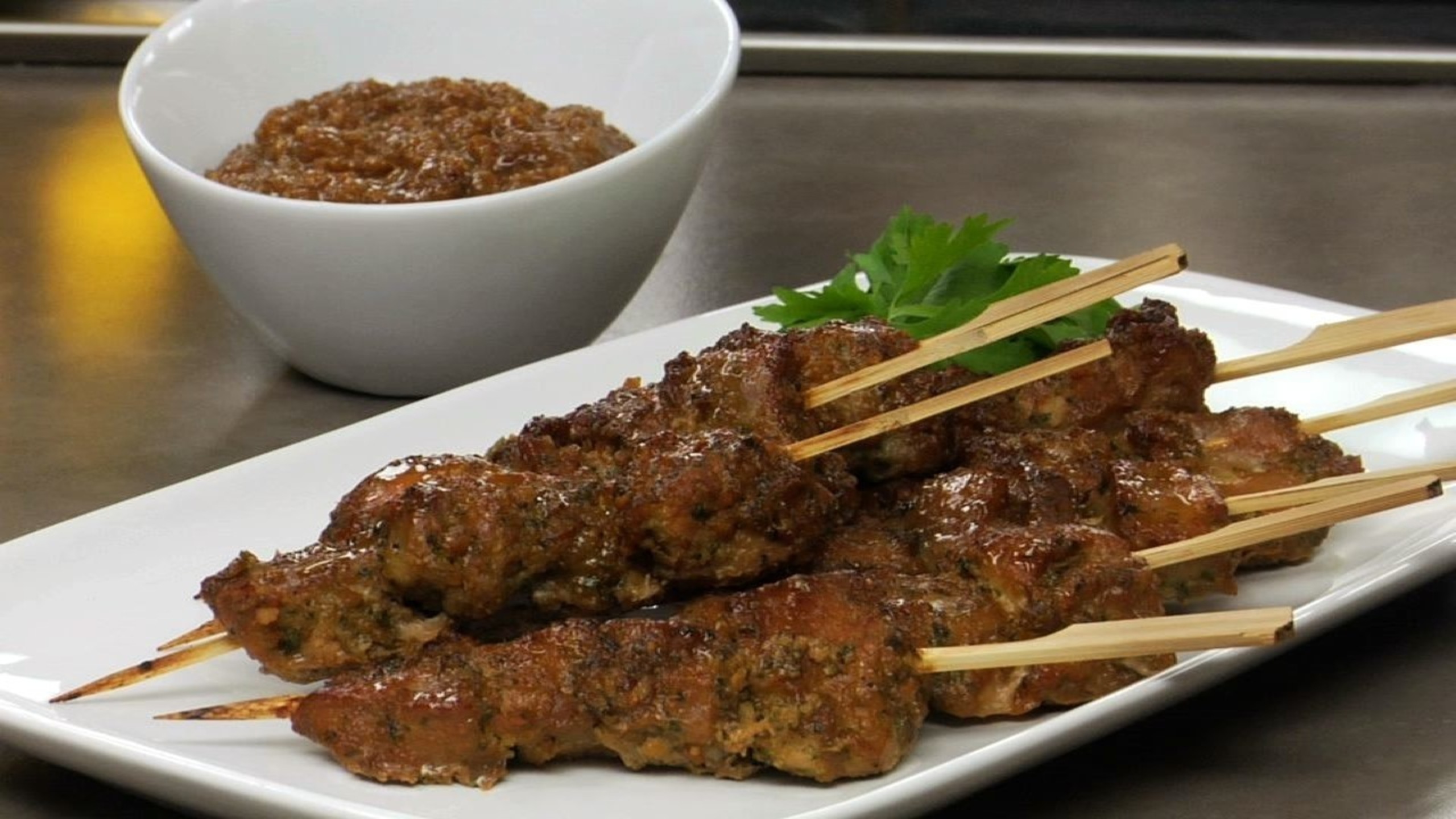 To cook the satays, preheat your oven to 400° degrees Fahrenheit. Place 3 or 4 pieces of meat onto each skewer, and set onto a parchment-lined baking tray.