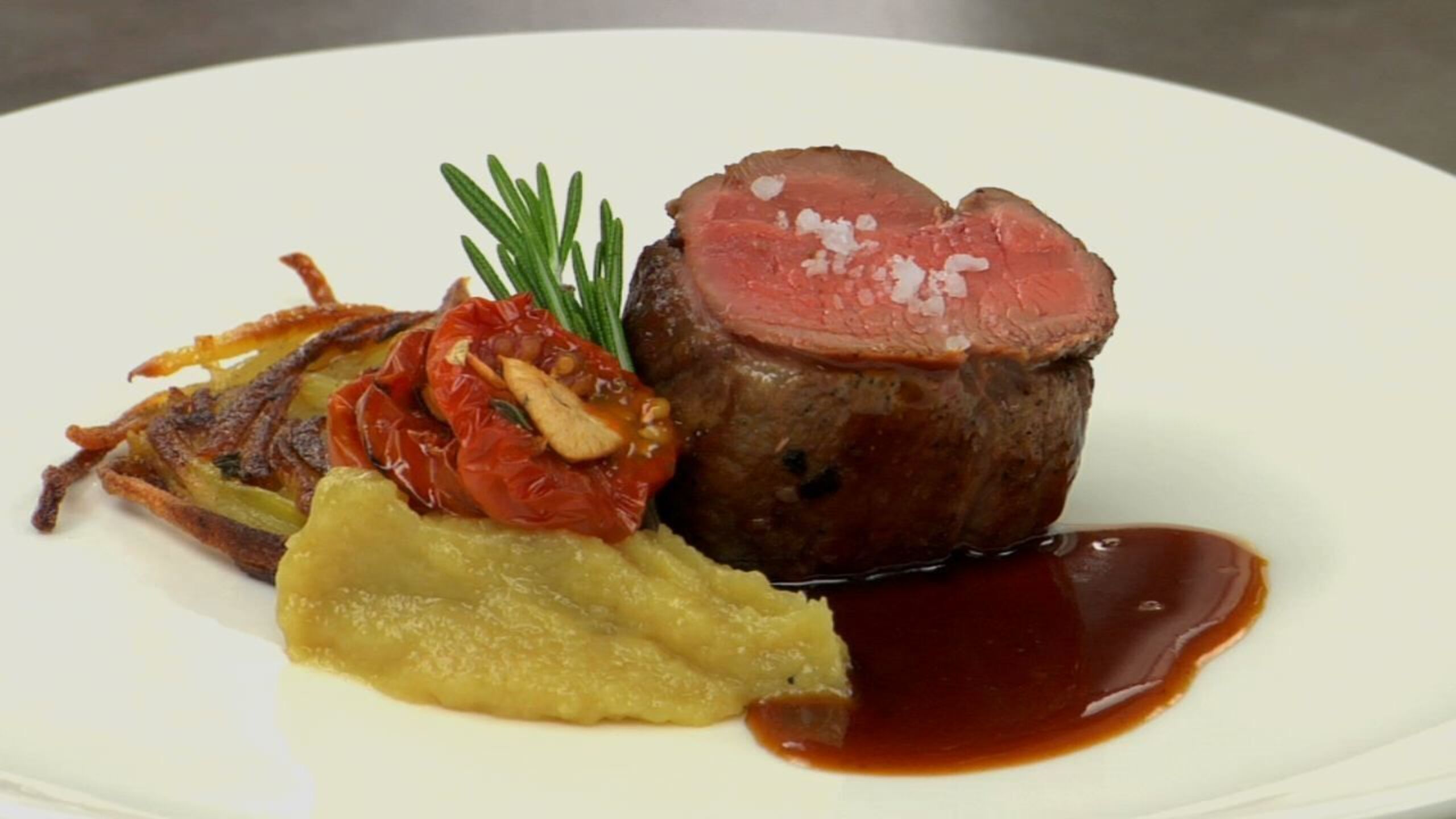 Plate one of the galettes, followed by a slice of the lamb, a dollop of the garlic purée and a few oven-dried tomatoes. Finish with a sprig of rosemary and drizzle with the lamb jus. For an added flavor, top the lamb with a pinch of Fleur de Sel and serve immediatey.