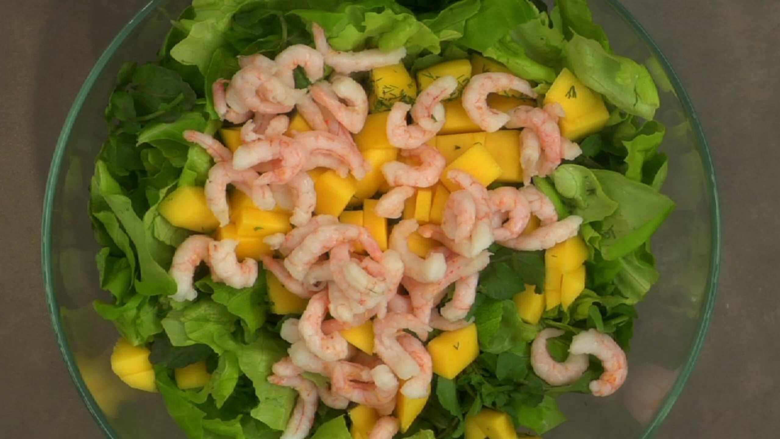Peel and dice the mango. Finely chop the mint and dill and add everything to the lettuce.