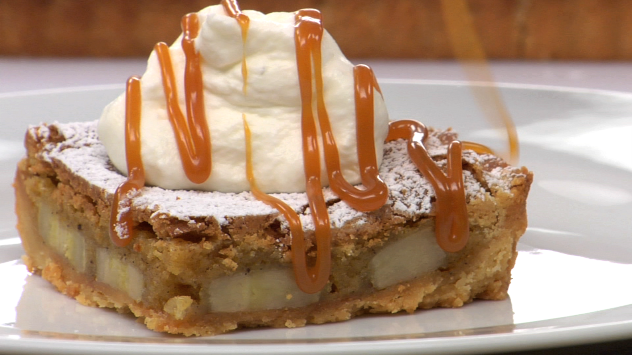 Slice the bananas into about 1/4" -inch thick pieces and lay the slices one layer thick onto the pre-baked tart shell. Pour over the butter mixture and bake for approximately 35 minutes or until set. Let cool for about 30 minutes before serving.Dust with icing sugar and serve with whipped cream.