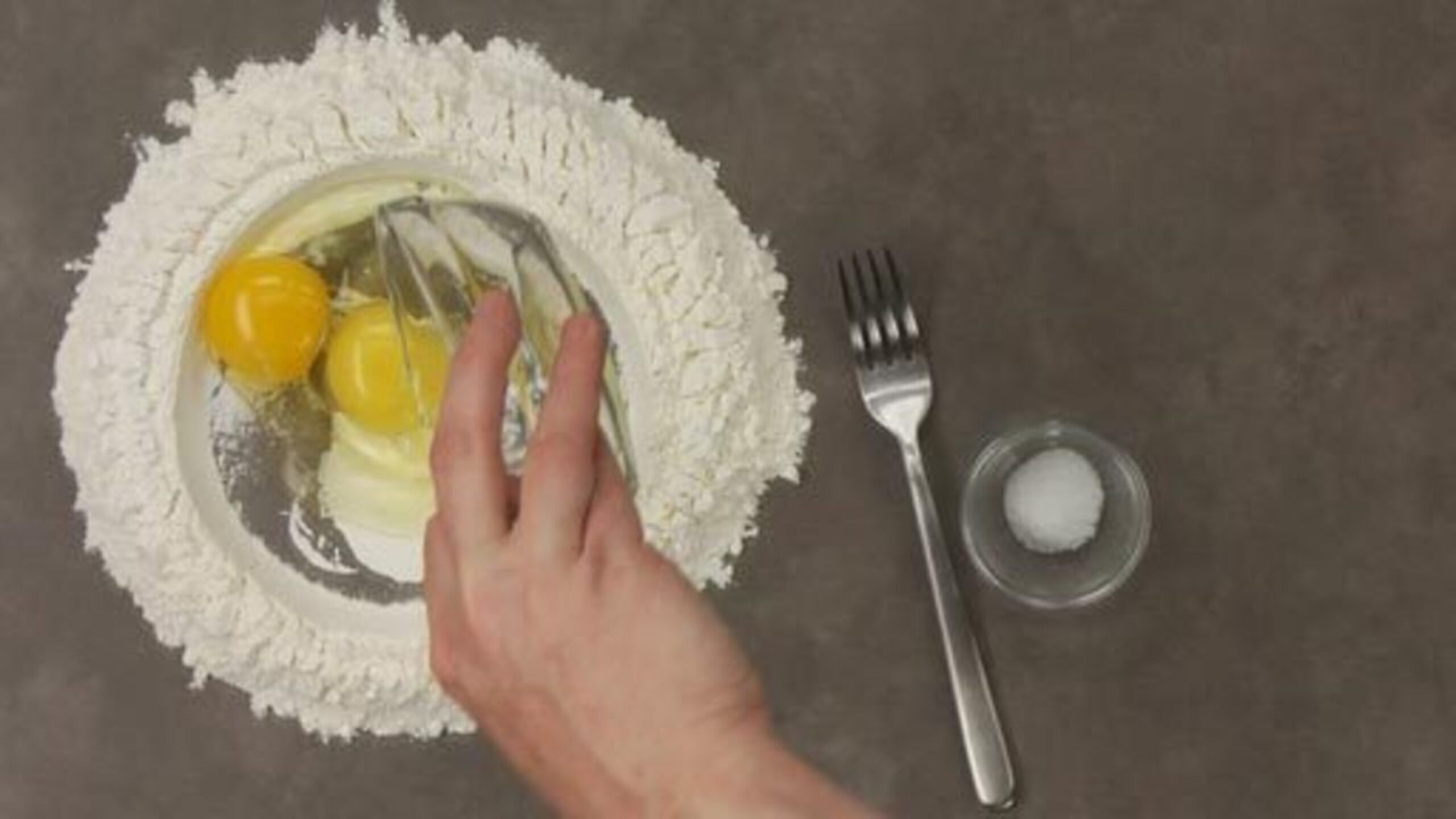 With a fork, mix to evenly combine. Place into the refrigerator while you roll out the pasta.