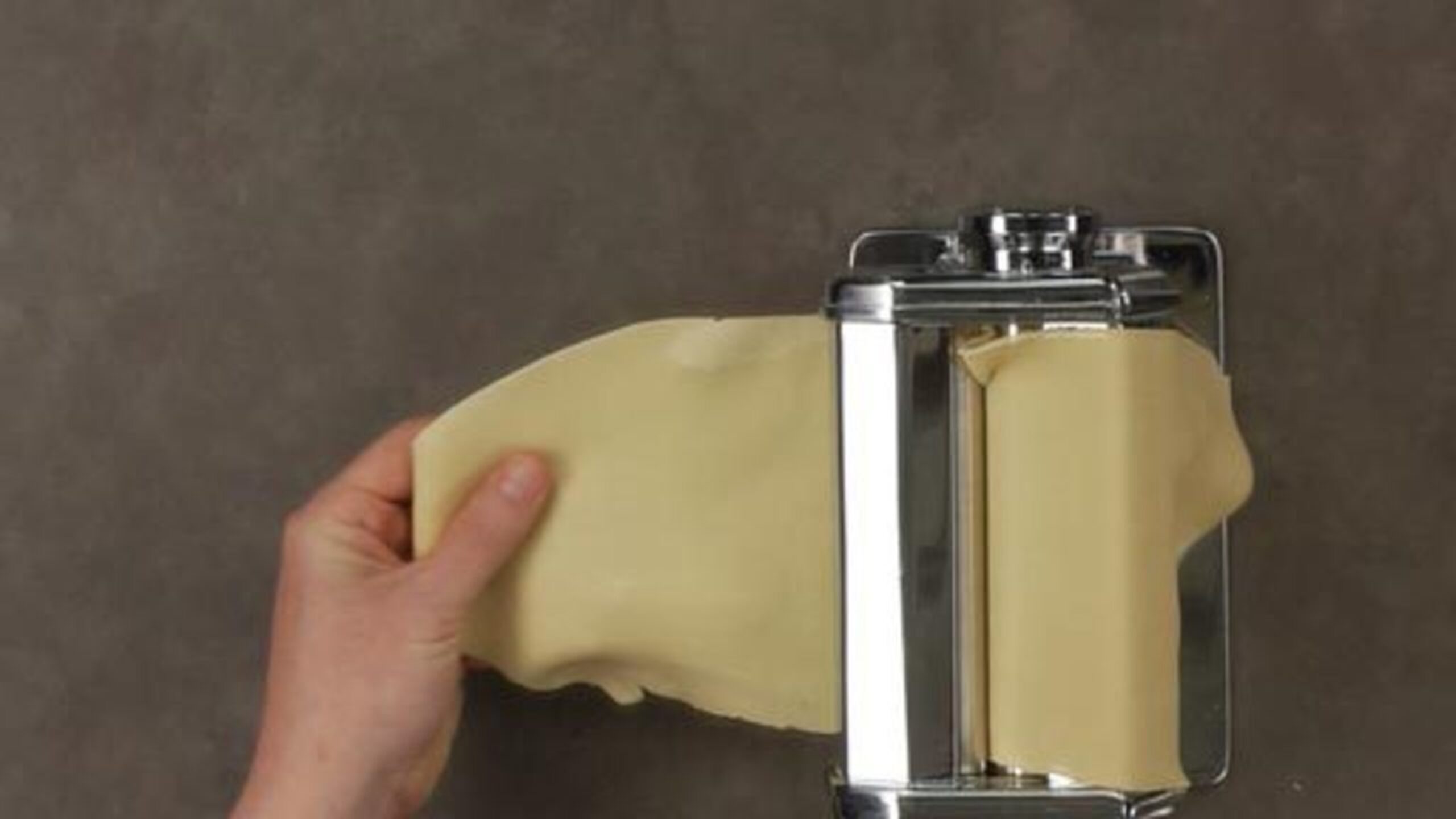 Once the dough has rested, roll out into sheets (roll upto the second-to-last setting on the pasta machine).