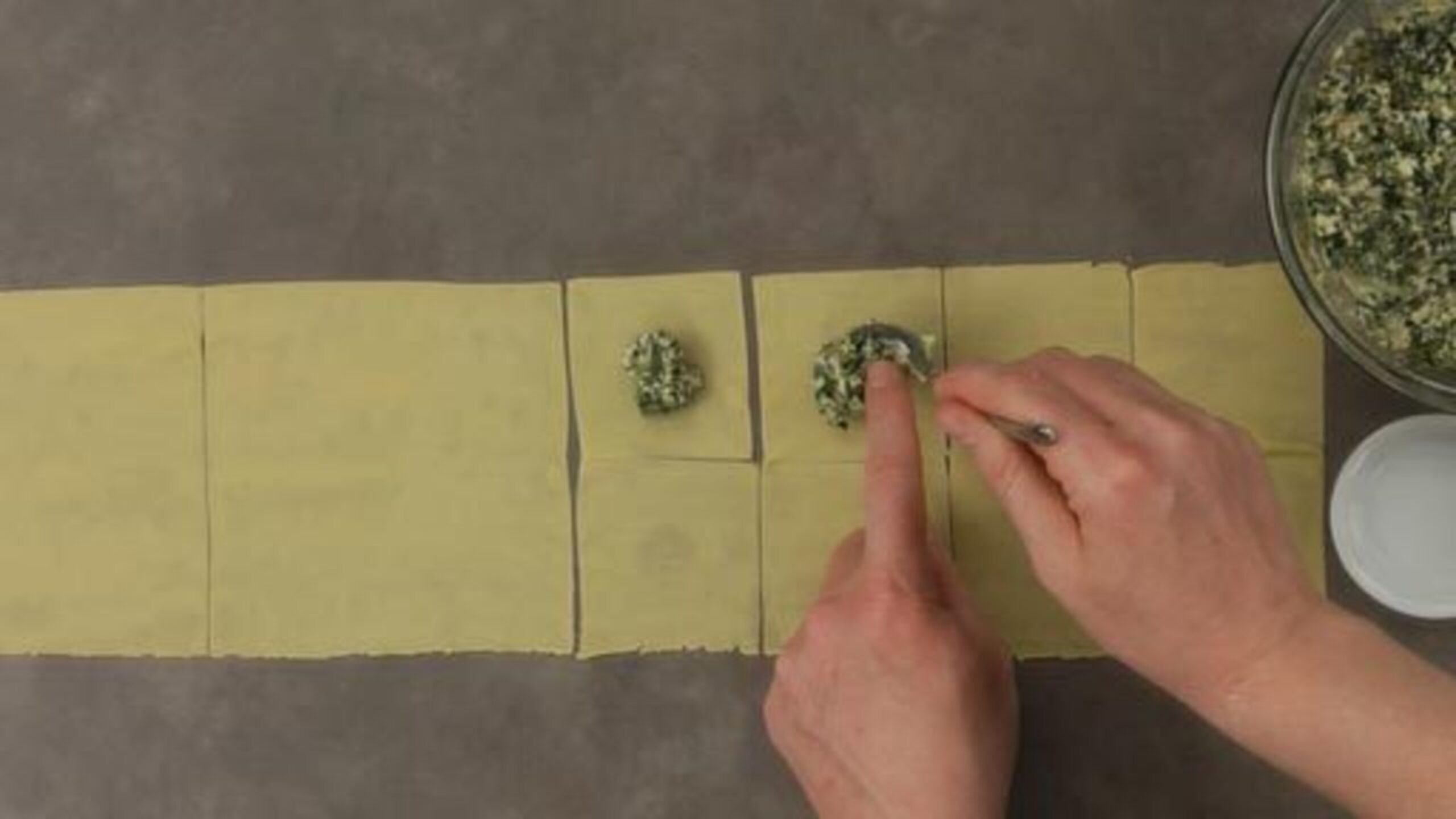 To fill the pasta, cut about half of the sheet of dough into 2"- to 3" -inch squares. Brush the edges with a bit of water, and then place about 1 teaspoon or so of filing into the center of each square.