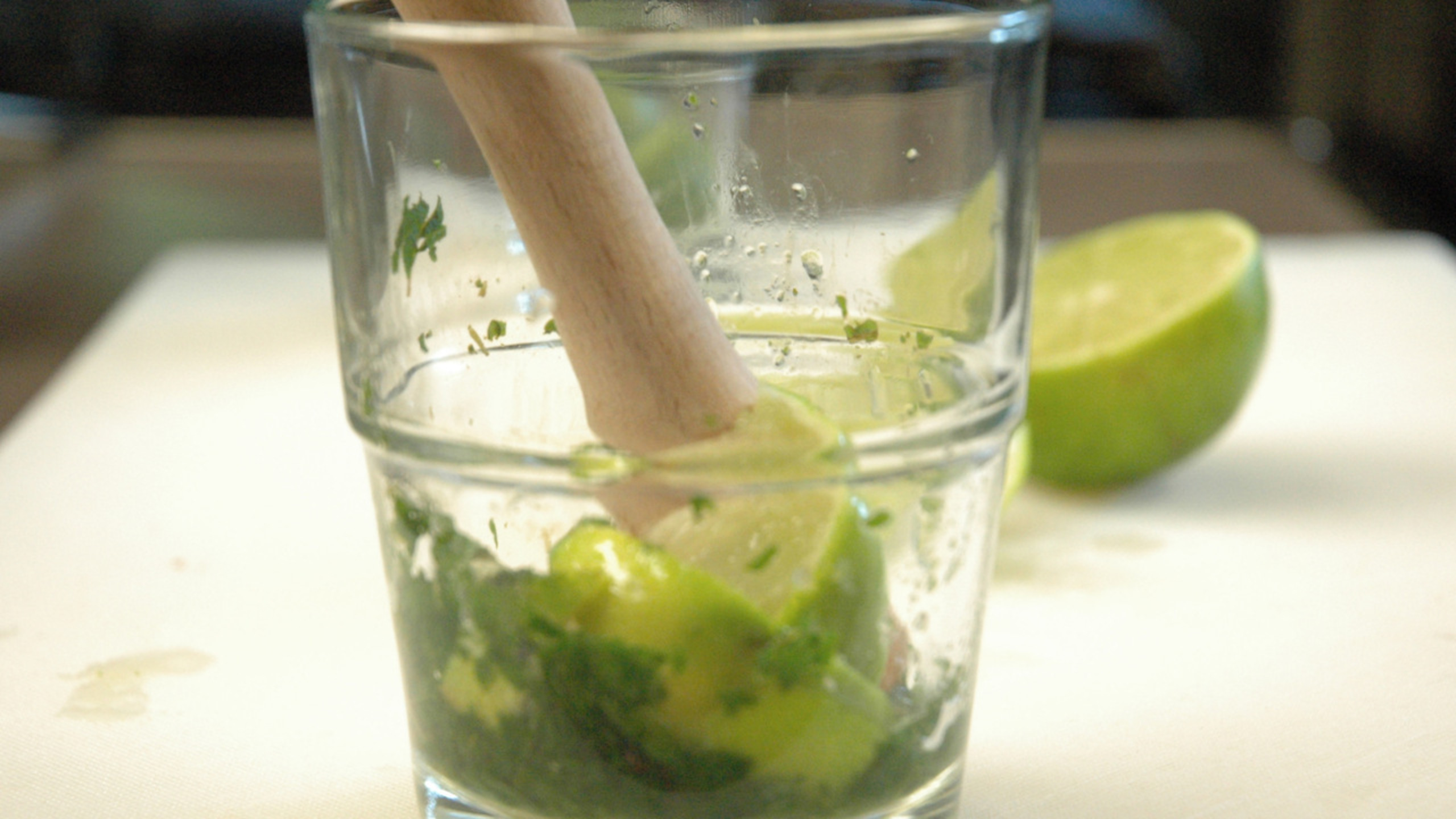 Press the mint leaves several times into the bottom of the glass without breaking them apart, all you want to do is release the mint oil. The typical tool for this is called a Muddler, a flat bottomed stick about 8 inches long. If you don’t have a muddler, anything else with that basic shape will work. I’ve used the handle of my Beachwood citrus juicer with good success.