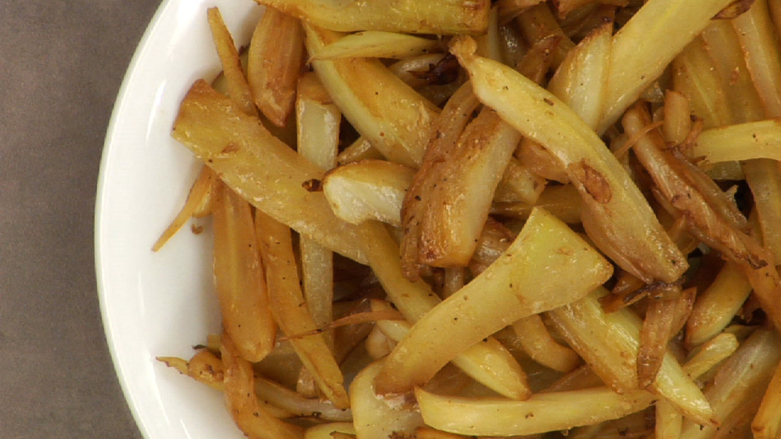 If the pan seems to be getting too brown before the fennel has cooked through, just add a touch of water. Once the fennel has caramelized and softened, but still has a bit of crunch, add the garlic and let cook for another 30 seconds or so. Then turn off the heat and deglaze with the lemon juice. Taste for seasoning and serve immediately.