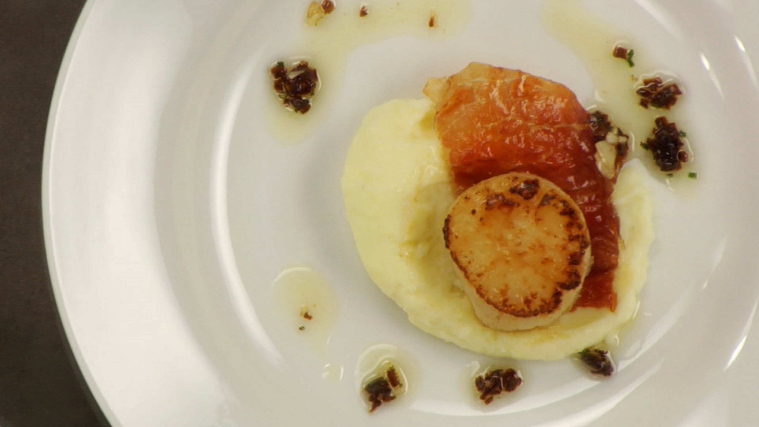 To plate the scallops, place a dollop of the mashed potatoes in the center. Lay a piece of crispy prosciutto over top, followed by one of the scallops. Drizzle the sauce around the plate and over the scallop. Finish with a pinch of fleur de sel and serve immediately.