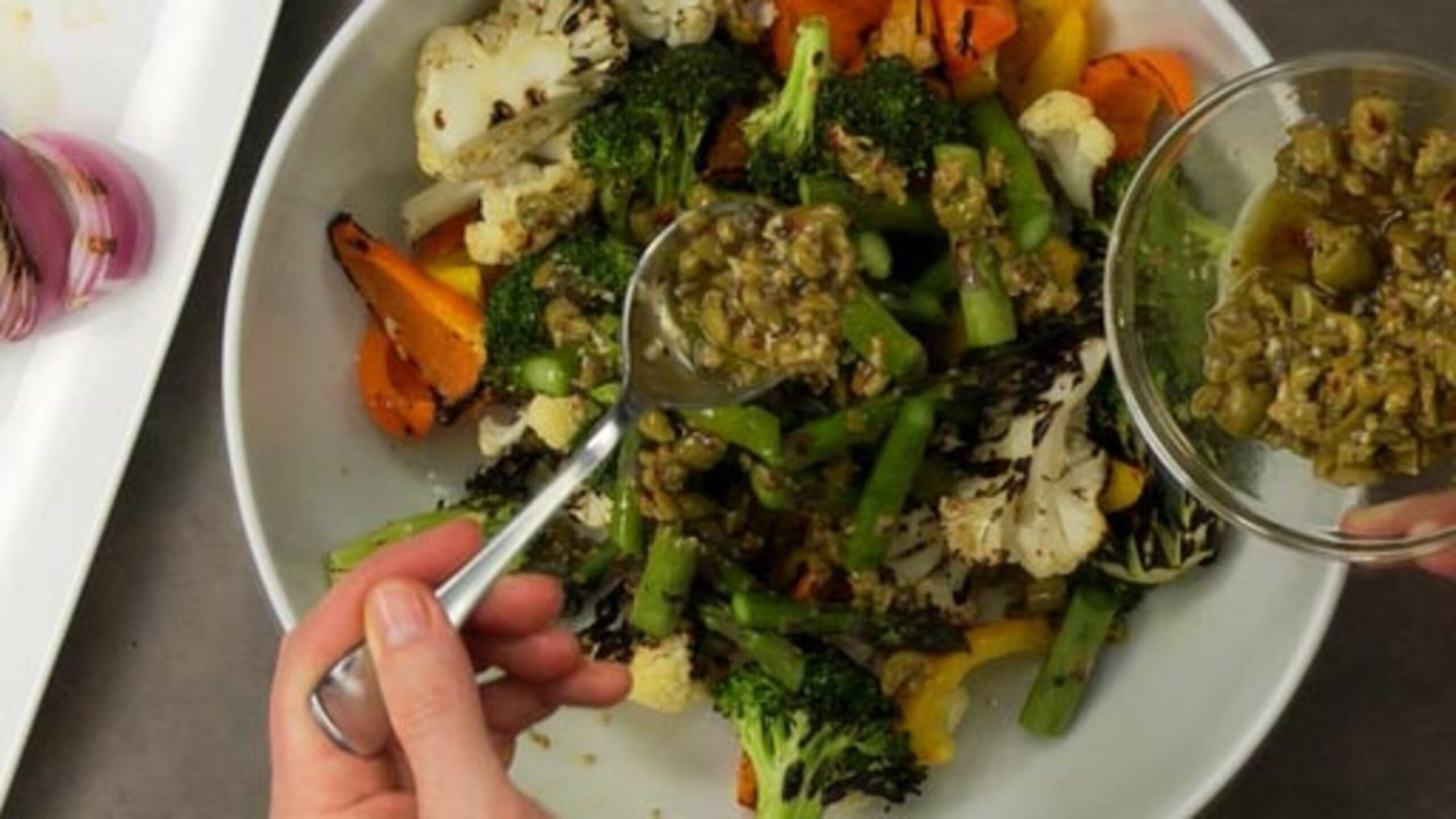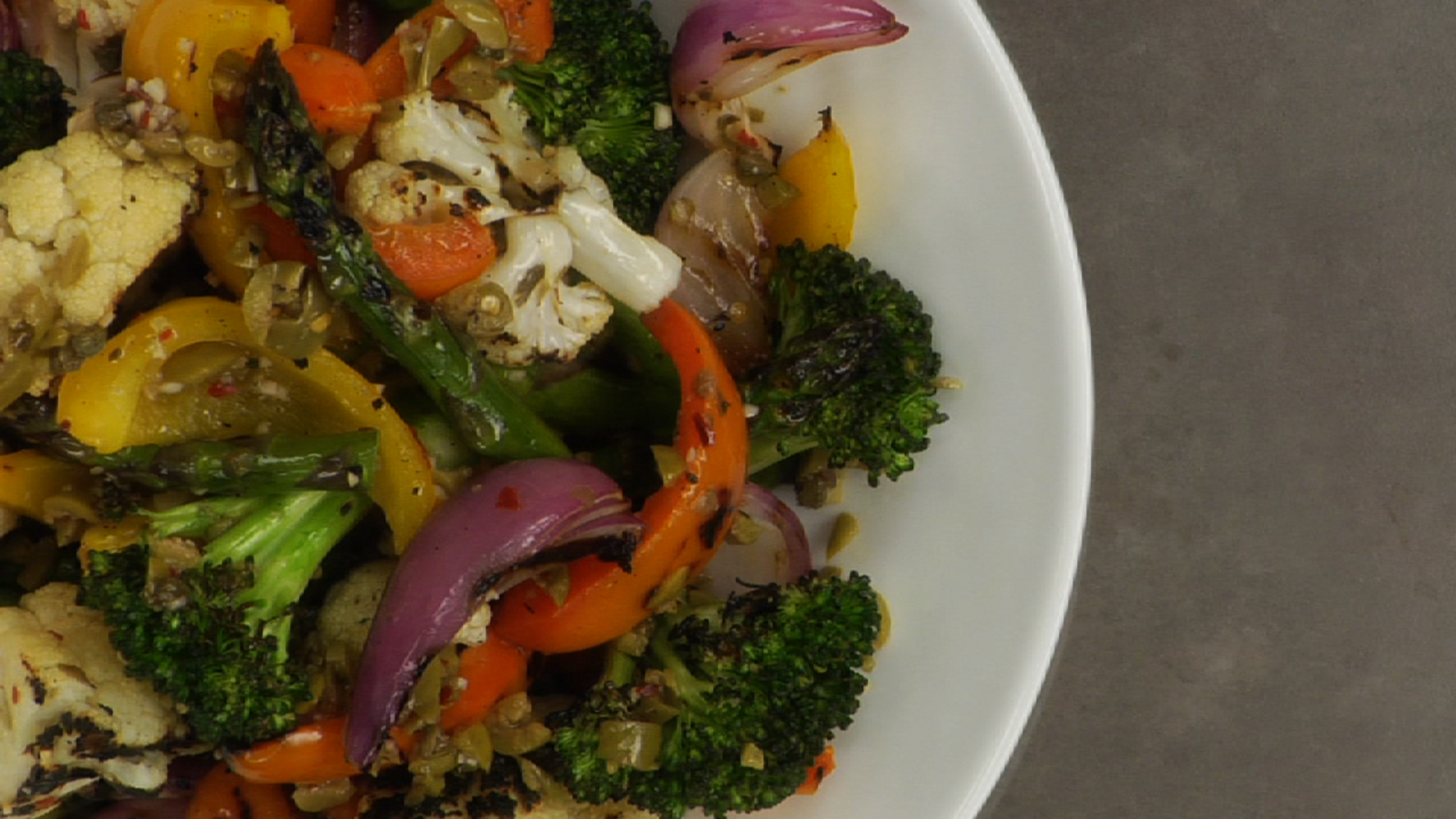 To finish the dish, cut the asparagus on the bias into thirds. Then place the cauliflower and broccoli into a large bowl and gently toss with some of the olive mixture. Keep layering and mixing the vegetables, leaving the most delicate ones to the end. Once done, transfer to a bowl and serve.
