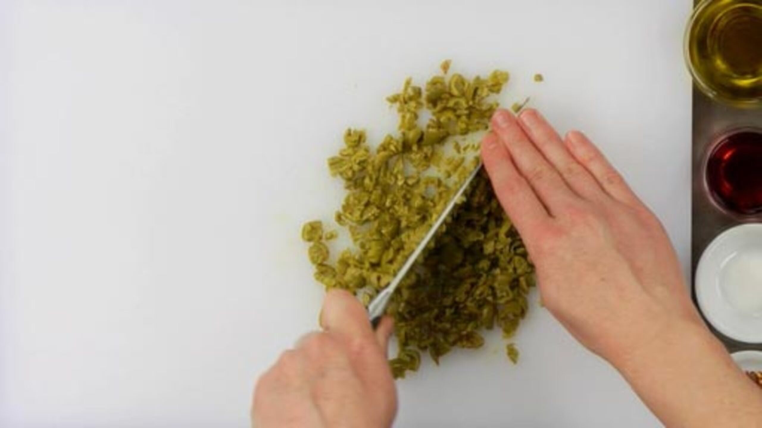 To prepare your mise en place, finely mince the garlic, roughly chop the capers and place both into a bowl. Next, pit and coarsely chop the olives. Add the sugar, chili flakes, red wine vinegar and extra-virgin olive oil and mix to combine. Set aside while you prepare the vegetables.