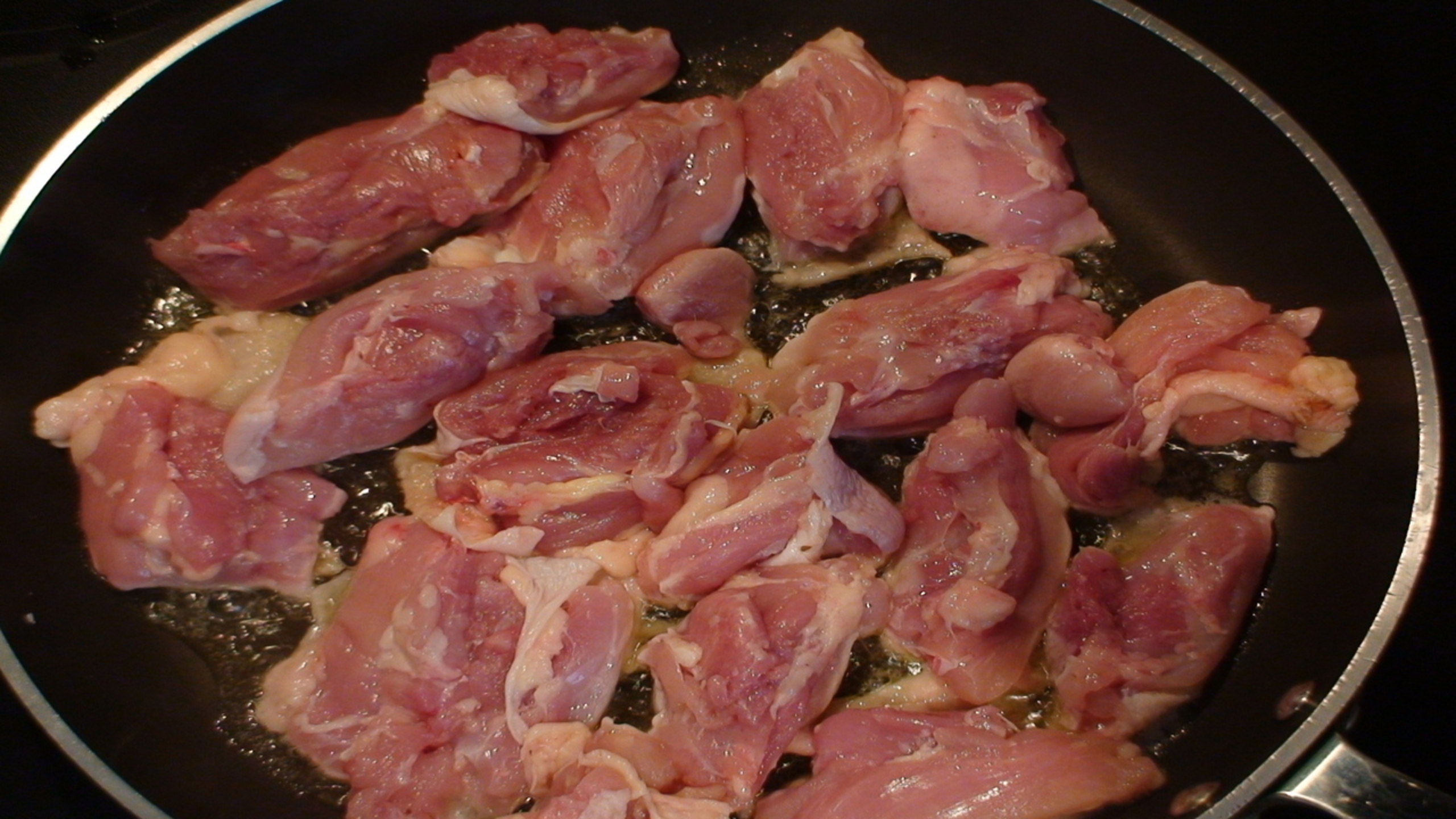 Heat your pan over medium high heat till hot then add the oil and butter. Once the butter has melted lay in all our chicken pieces.