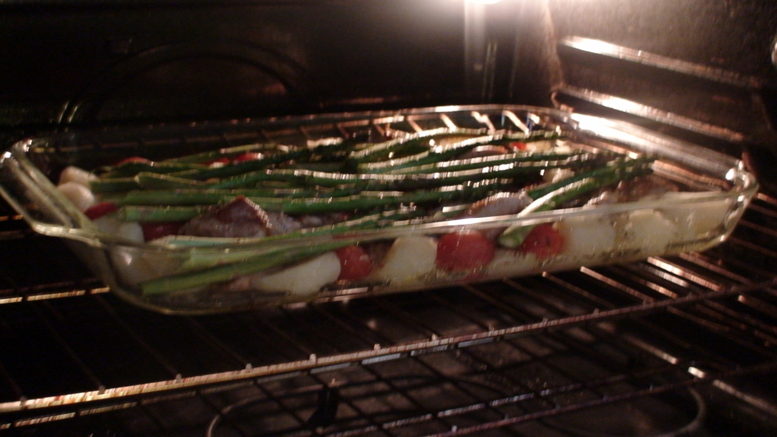 Place the dish uncovered into a 375 degree oven and bake till you see the potatoes starting to take on some color. Approximately 20 to 25 minutes. The asparagus should be tender and well cooked by then as well. Place this in the center of the dinner table and dig in.