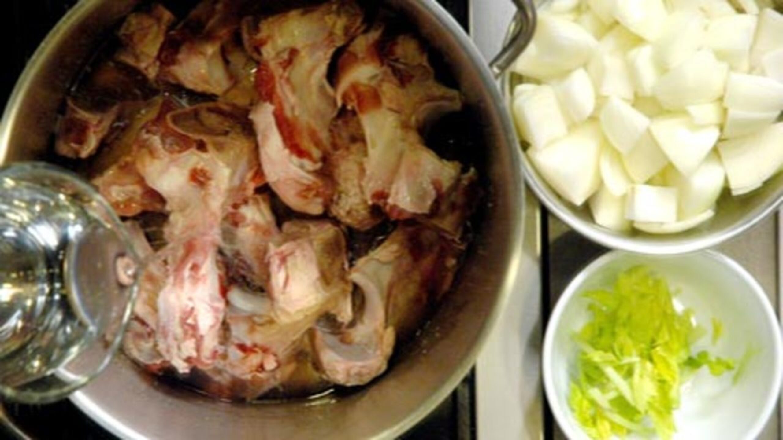 To prepare the bones, rinse under cold water and add to a 10 to 12 L/qt stock pot. Fill with enough cold water to cover the bones by at least two inches.