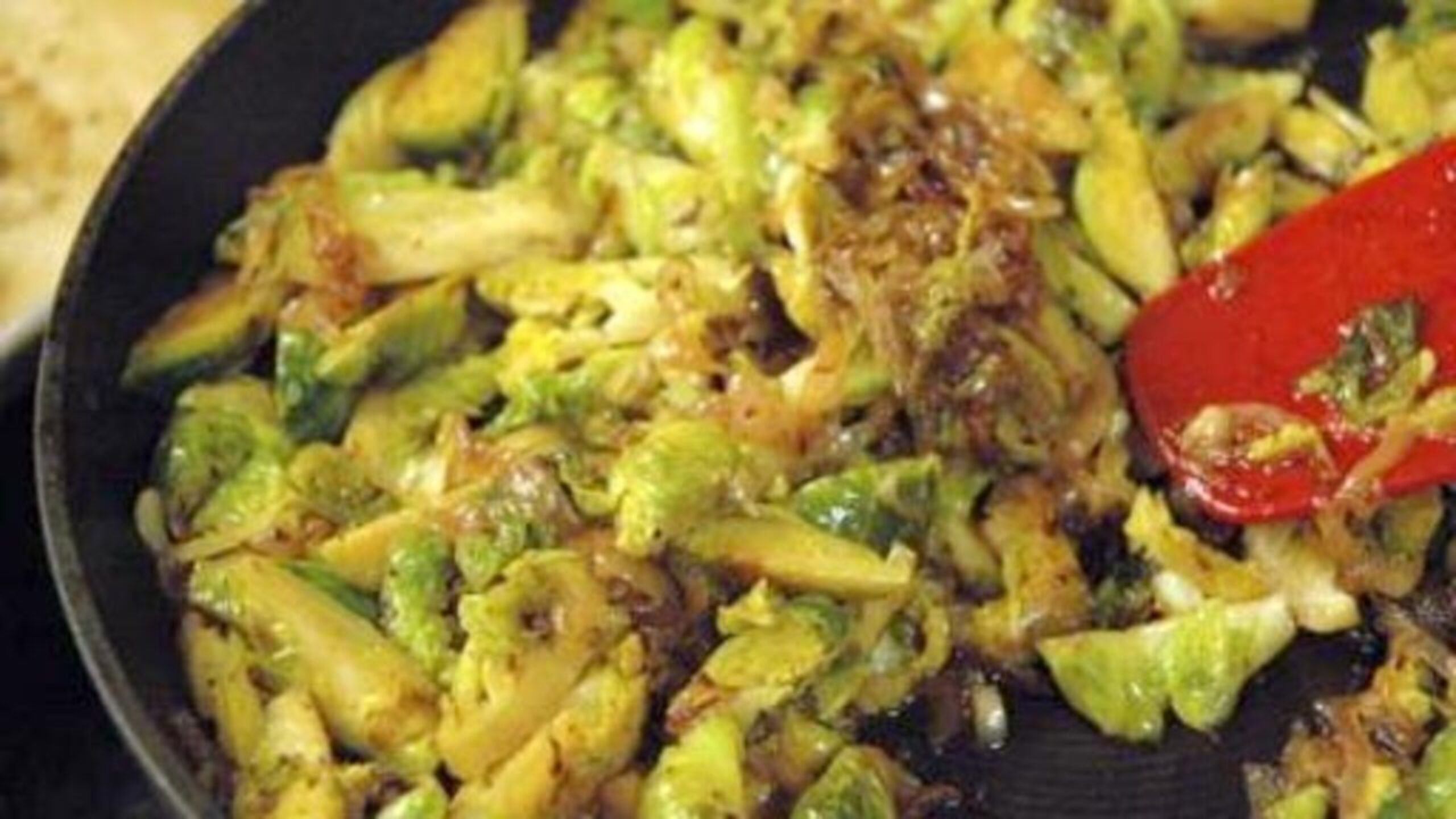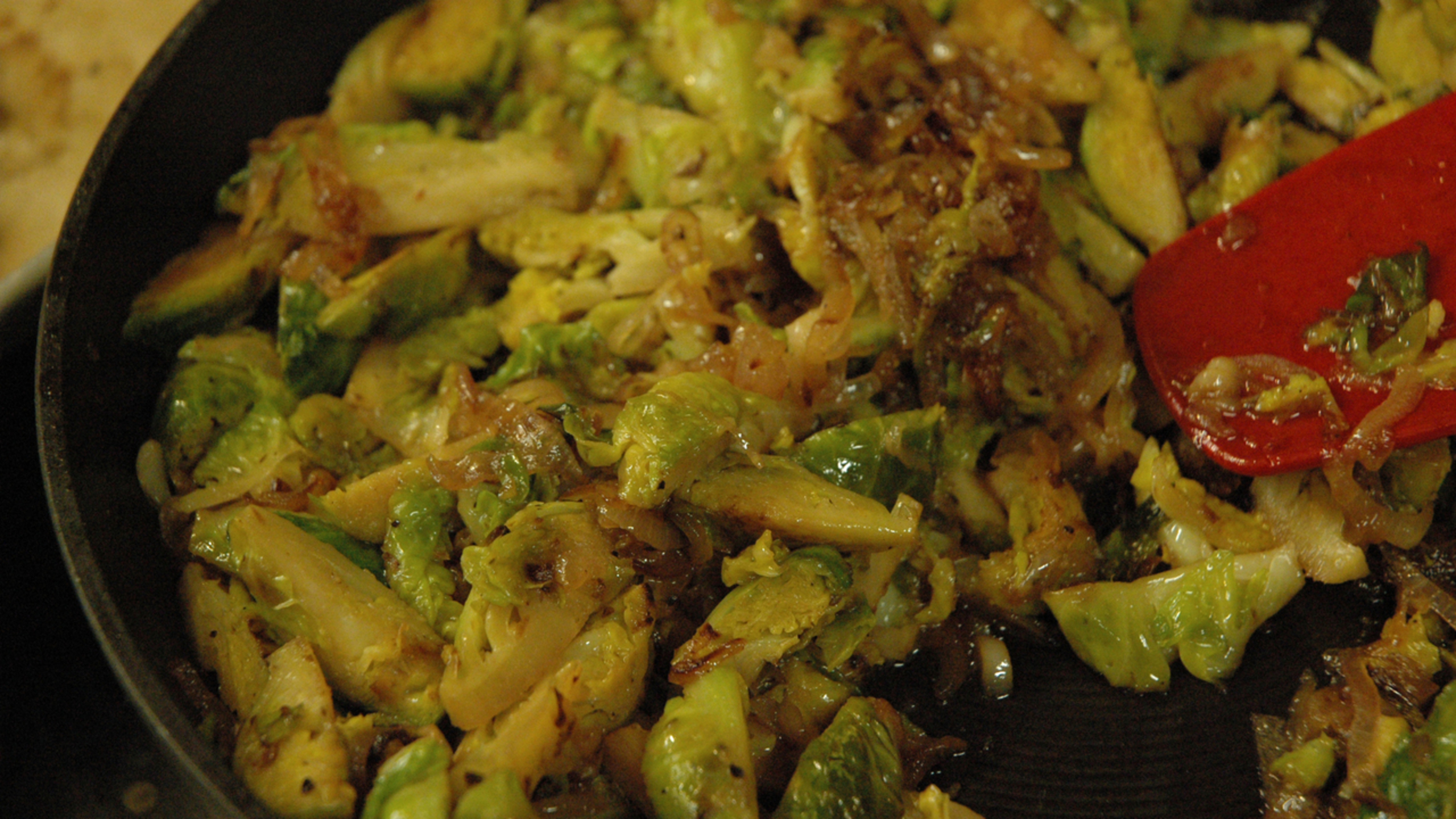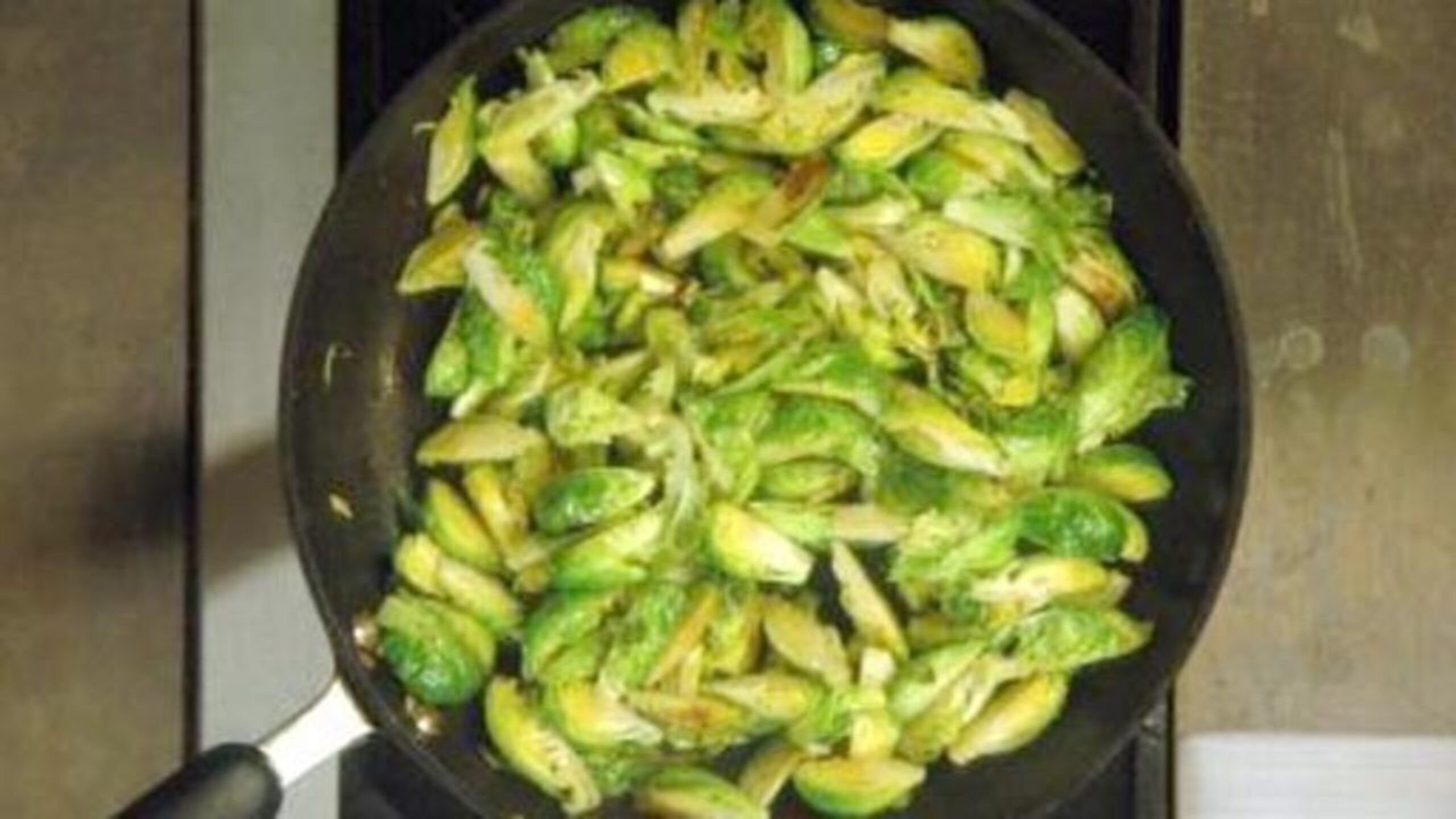 To finish the dish, fold the shallots into the Brussels sprouts. Check for seasoning and serve immediately.