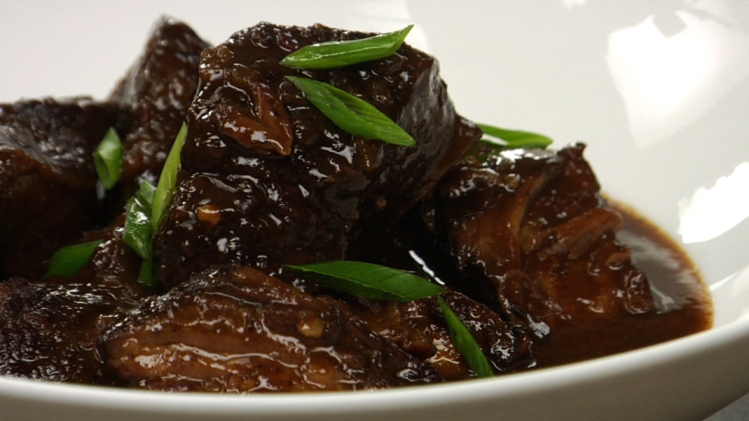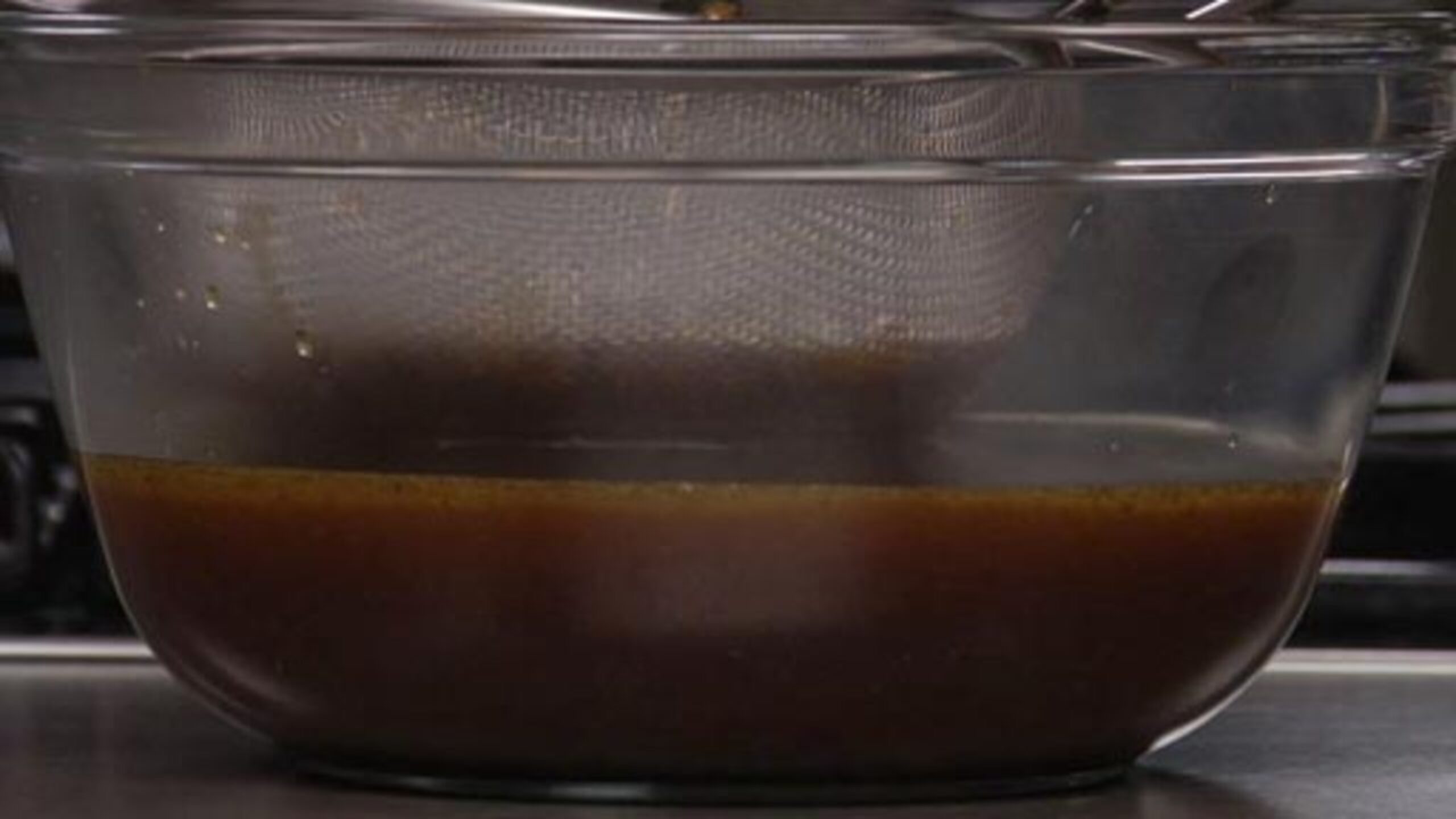 To prepare the sauce, strain the braising liquid into a bowl. Remove the excess fat by spooning off as much as you can from the surface. (Alternatively you can make the ribs ahead and cool the dish in the refrigerator overnight. This will make the fat much easier to remove.)