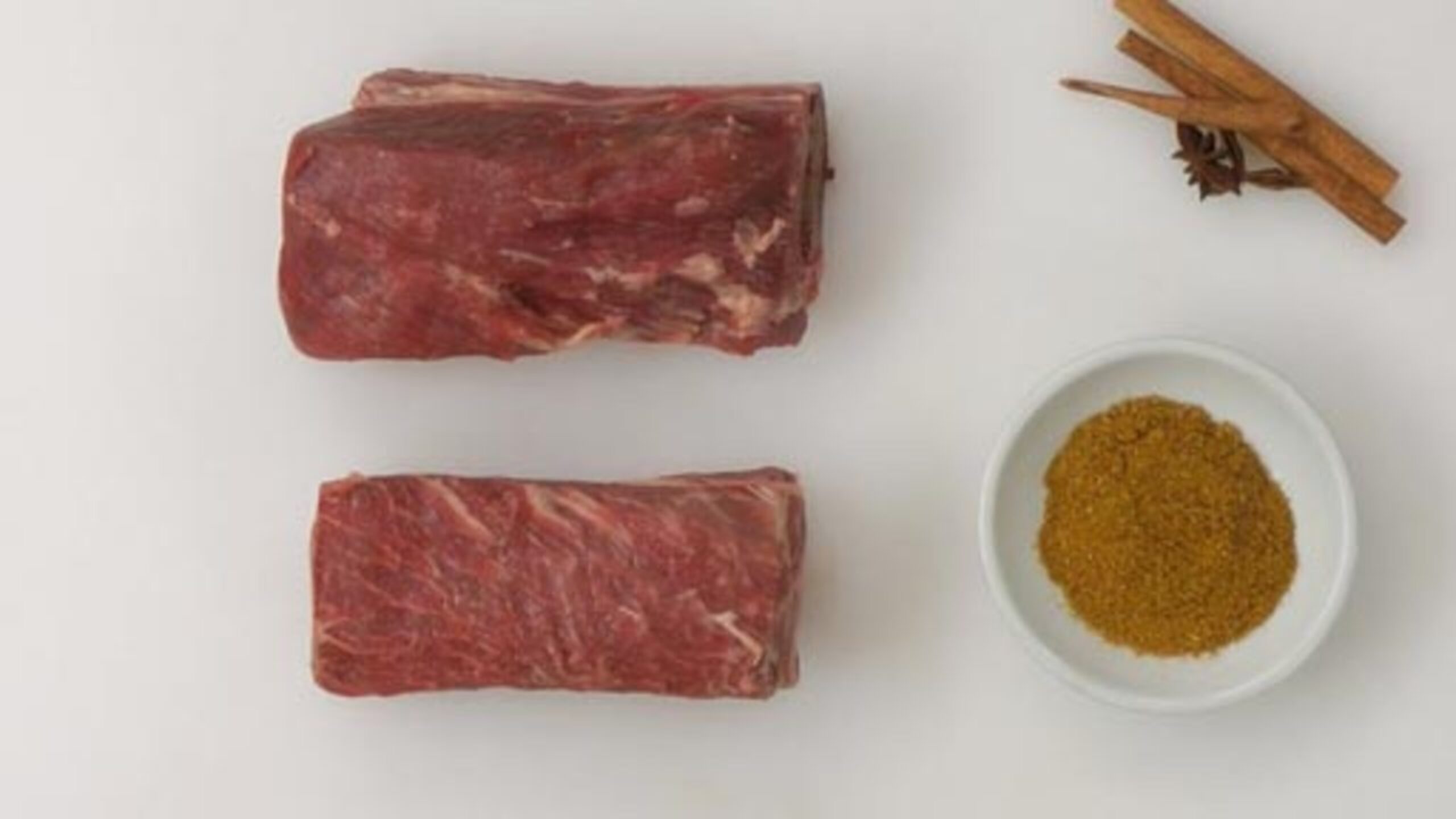 To start, trim off any silver skin from the ribs. Rub the ribs with the meat curry powder. Cover with plastic wrap and refrigerate for at least 2 hours or even overnight.