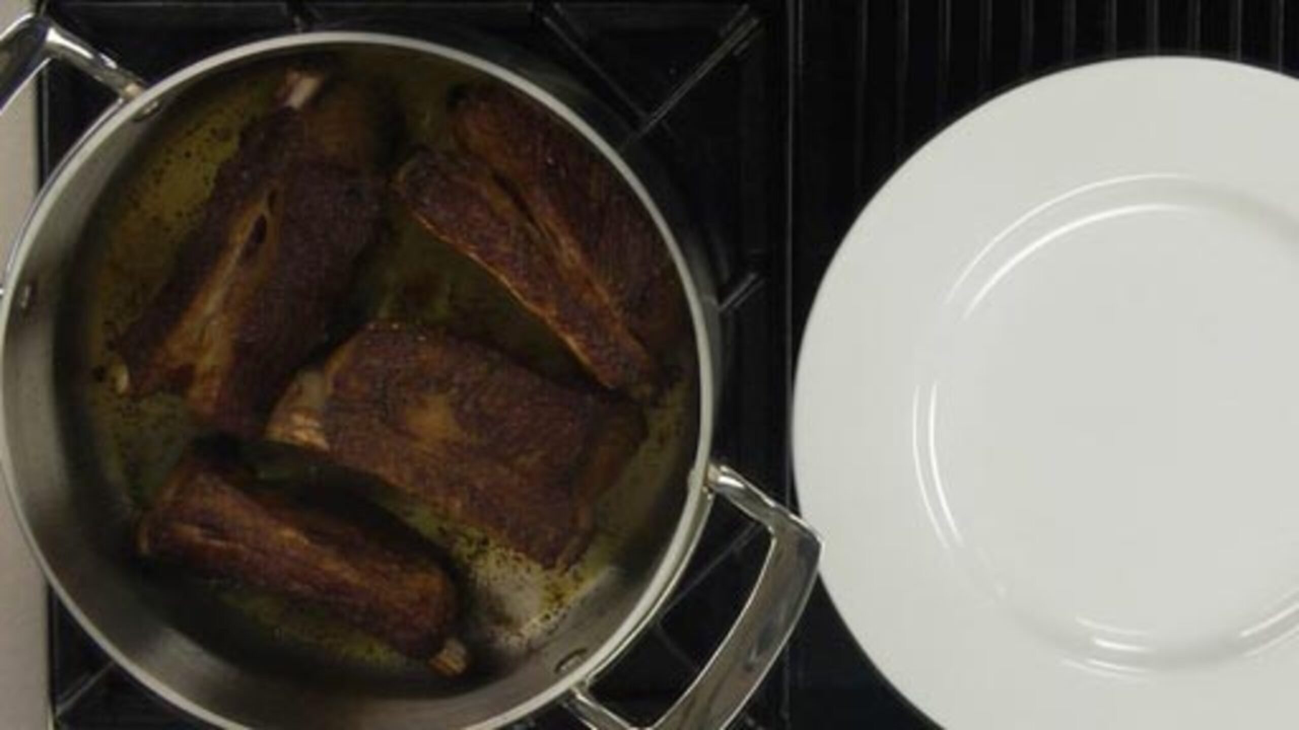 To brown (sear) the ribs, heat a heavy-bottomed pot over medium to medium-high heat. If needed, pat the ribs dry but be careful to not rub off the spices. Once the pot is hot, add the oil and brown the ribs in a single layer. Brown each side for about 3 or 4 minutes. Use tongs to turn the ribs and once the ribs are completely browned, transfer them to a plate.