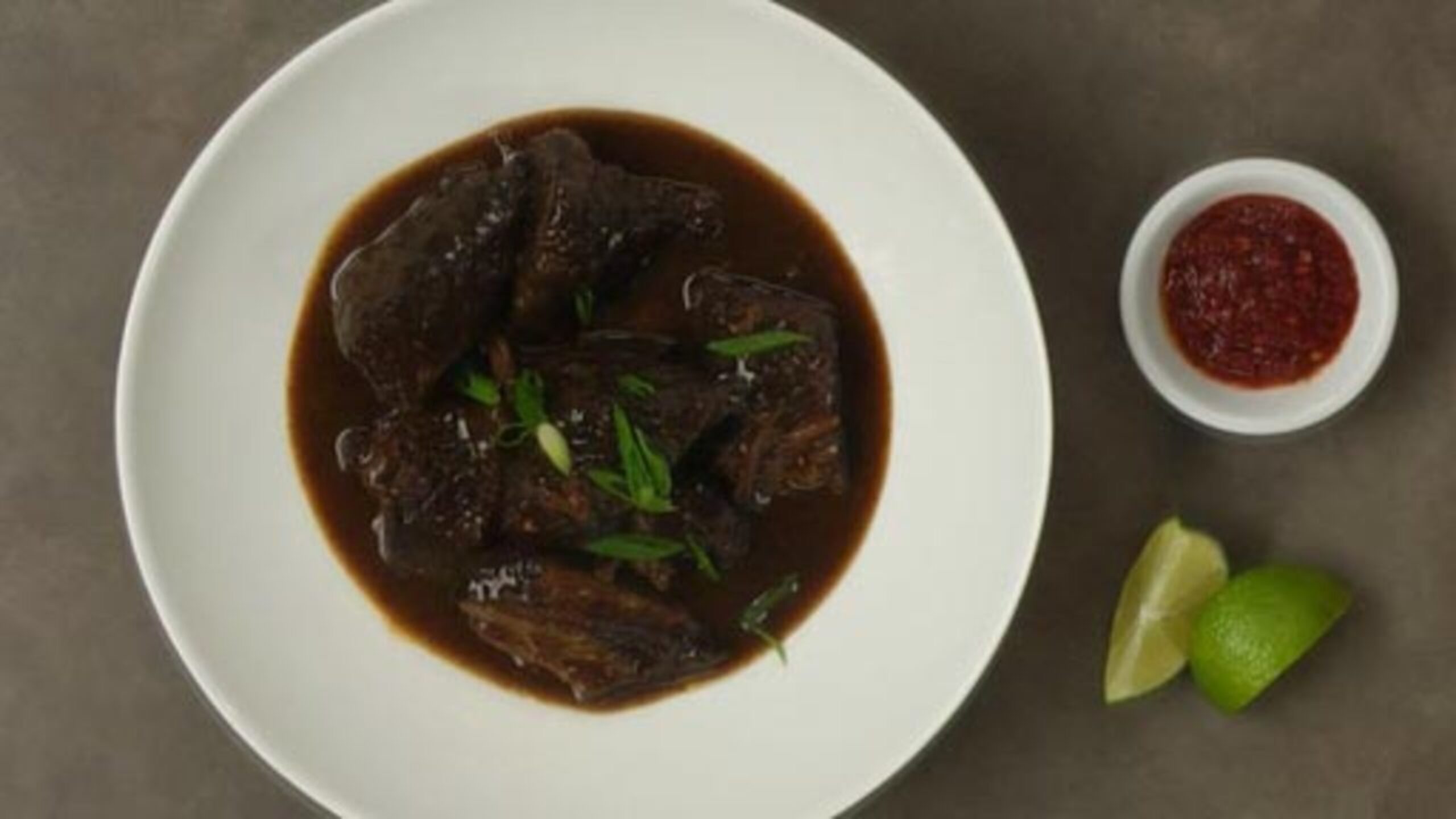 To finish the sauce, add the palm sugar, tamarind paste, sambal oelek and fish sauce. To enrich the sauce, you can add a bit of coconut milk. Let this simmer gently for a few minutes and then add the ribs back to the sauce. If you like, you can first remove the meat from the bones and break into pieces. Any excess fat can also be removed, if desired.