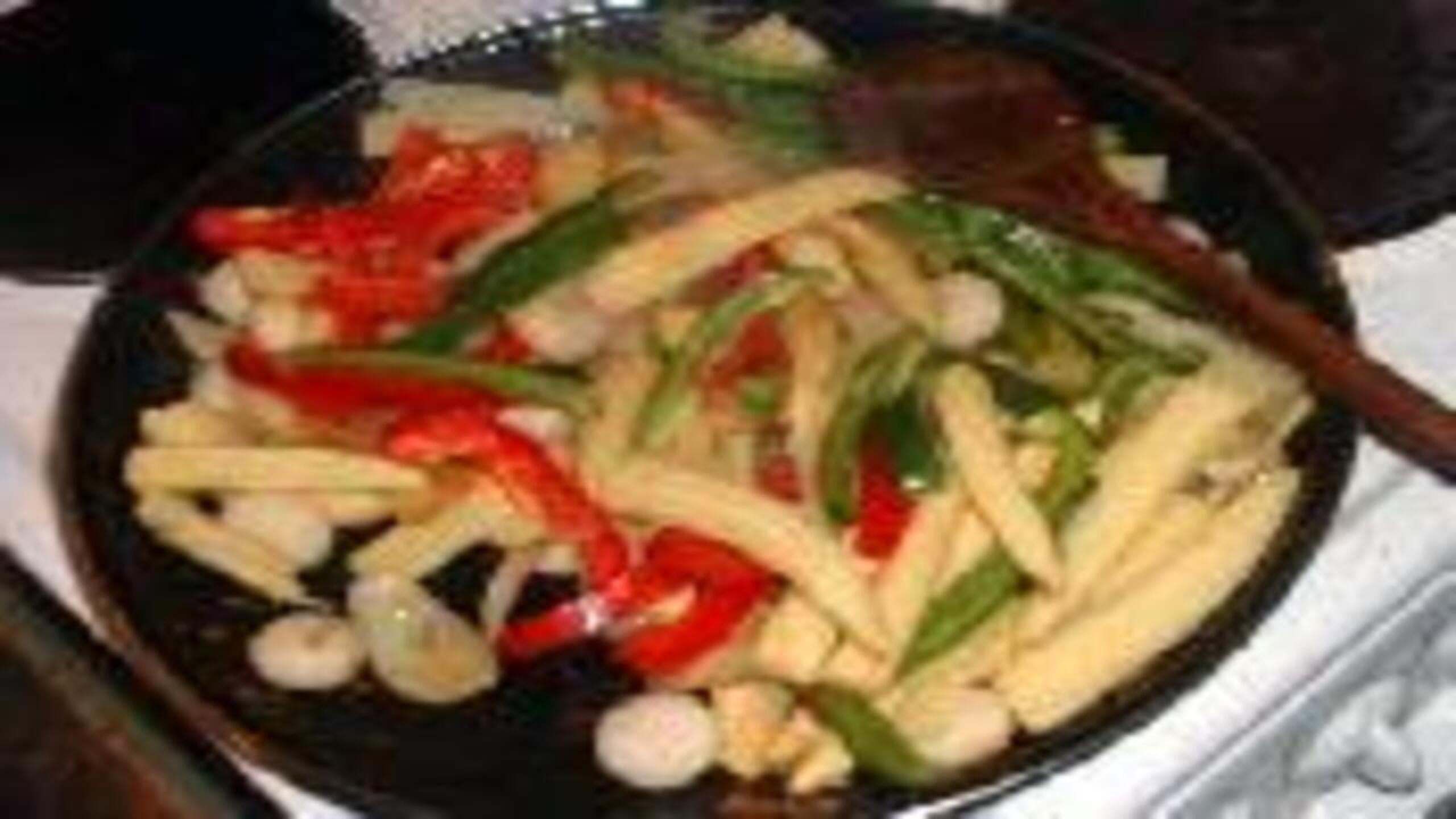 When the onions are golden add the bell peppers, corn, bamboo shoots and the water chestnuts and stir-fry for 5 minutes or until the vegtables are tender.